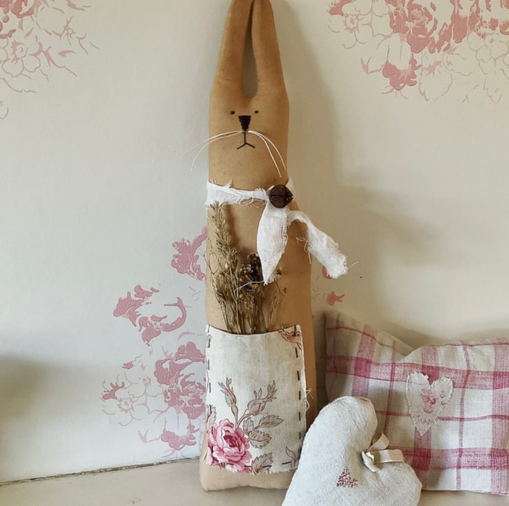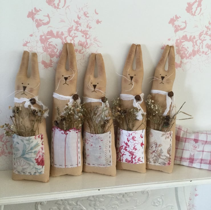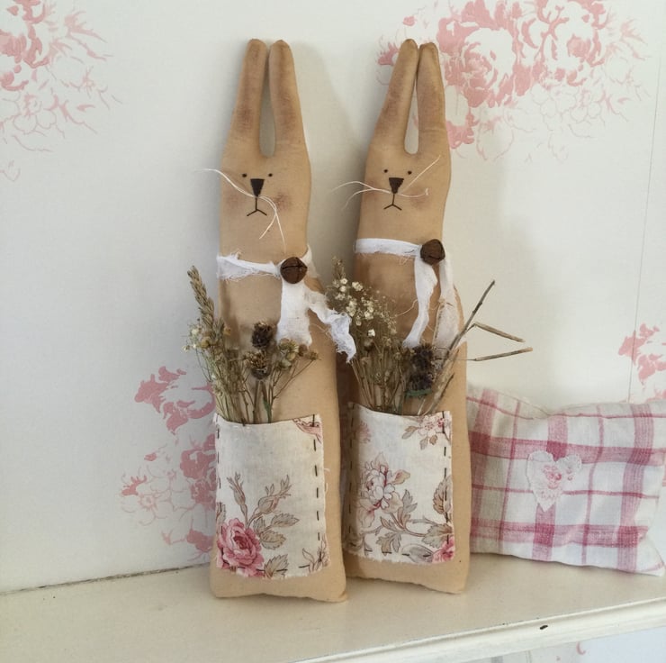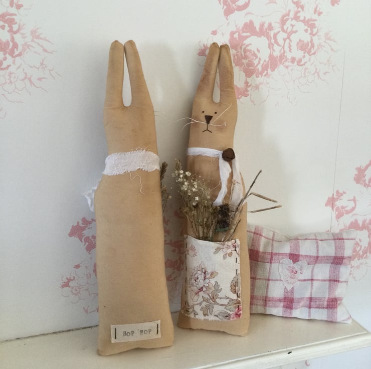 The fabric has been tea stained to give it a lovely rustic appearance. Embroidered facial features with whiskers adds to the cuteness, and each bunny has a tied collar fastened with a rusty jingle bell.