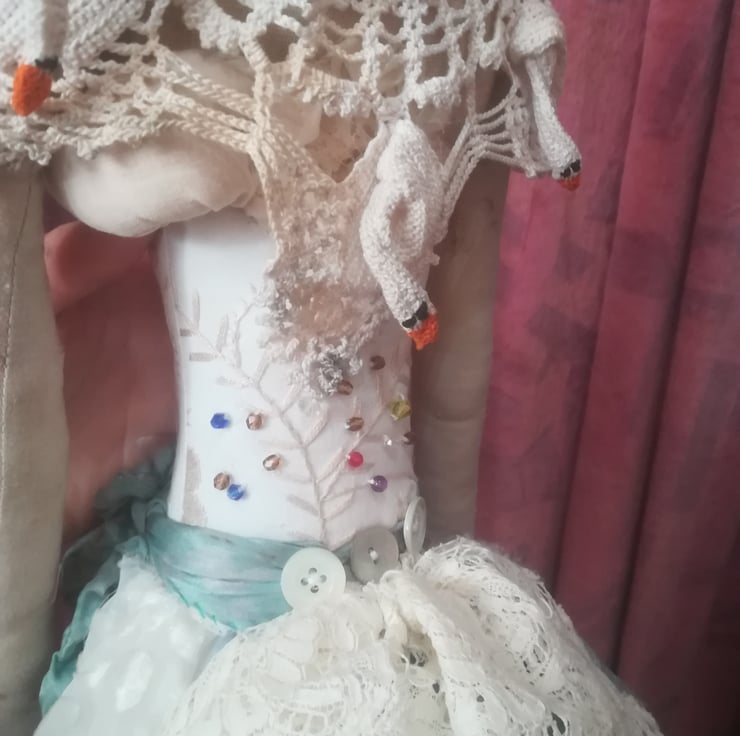 She comes with a small papier mache Swan finished with tiny pieces of vintage embroidered linen and topped with glitter.