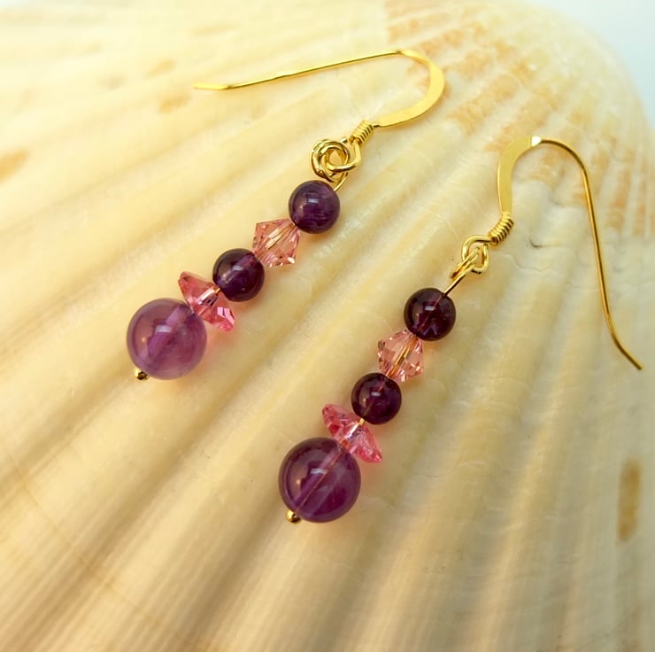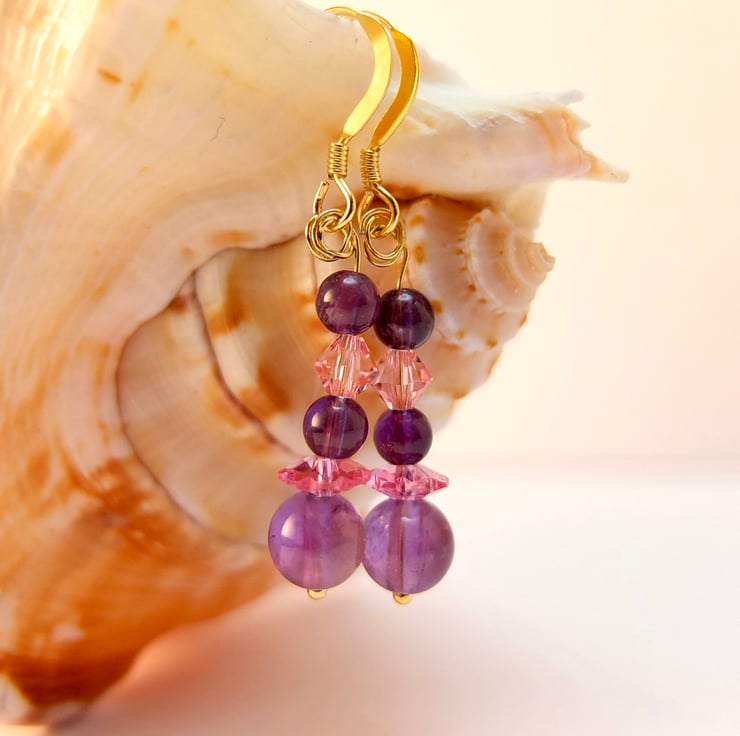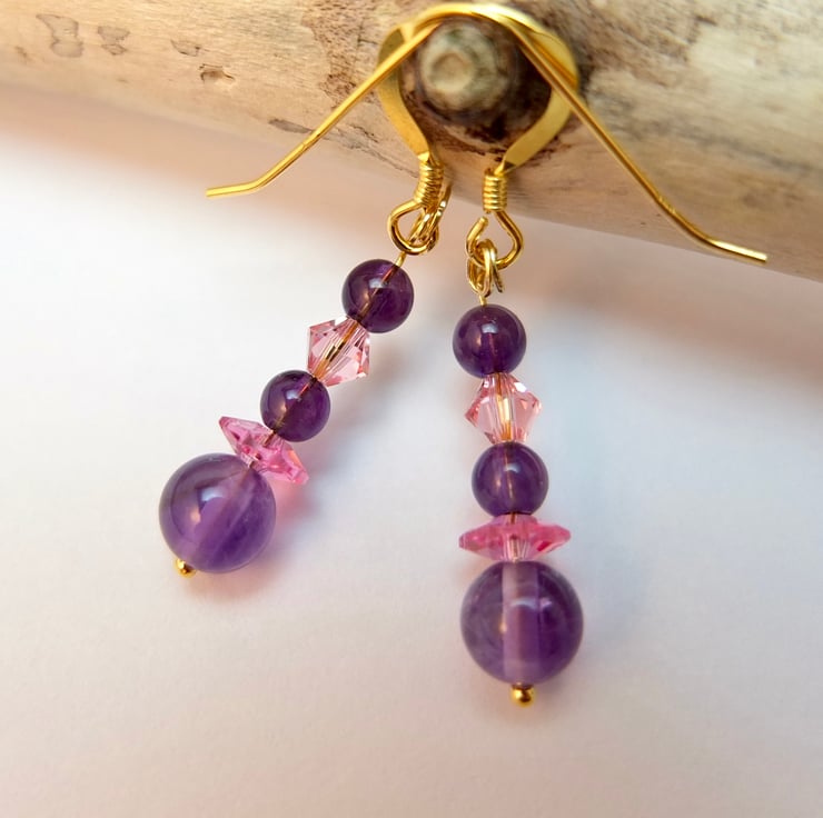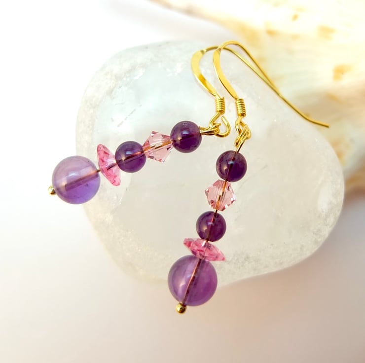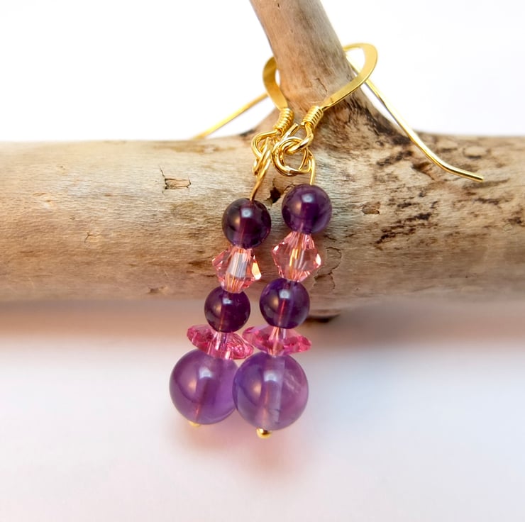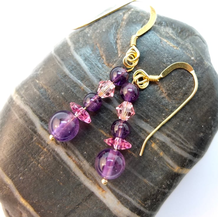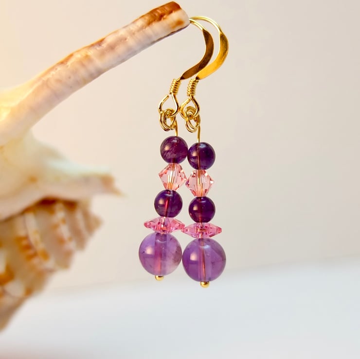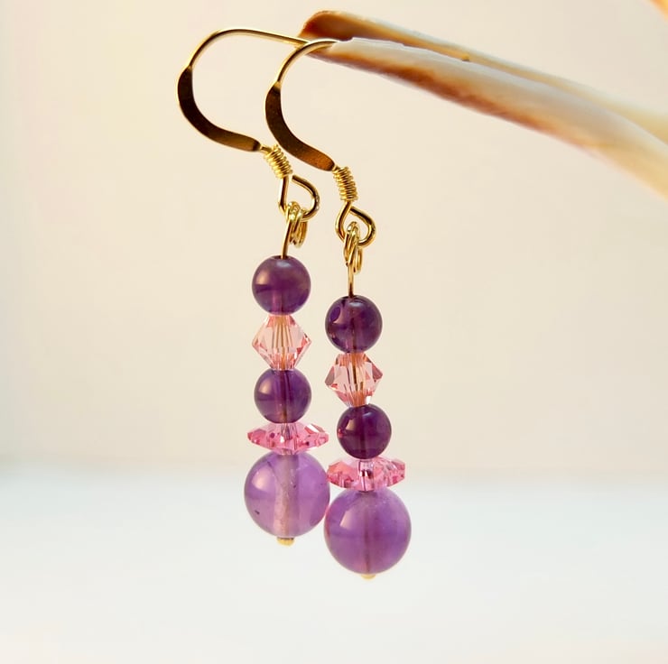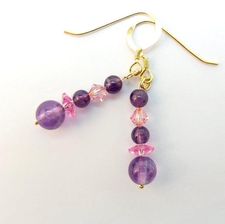 Pretty, sparkly earrings of 6mm and 4mm amethyst beads, a 6mm "rose" Swarovski flower bead and a 4mm "light amethyst" Swarovski bicone.