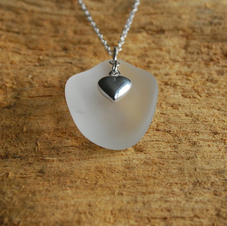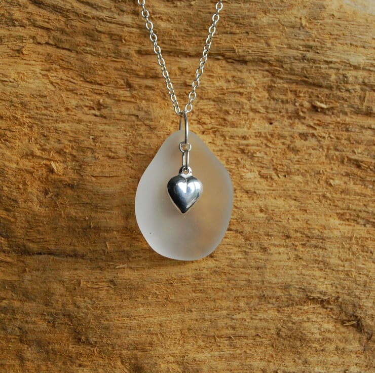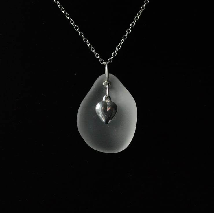 We love to use curved beach glass behind charms to create our pendants. This piece of tumbled beach glass is very curved, which suggests it's come from the neck of a bottle such as a sauce or wine bottle. The shape and curve of the glass go perfectly with the sterling silver puff heart charm as can be seen in the photos.