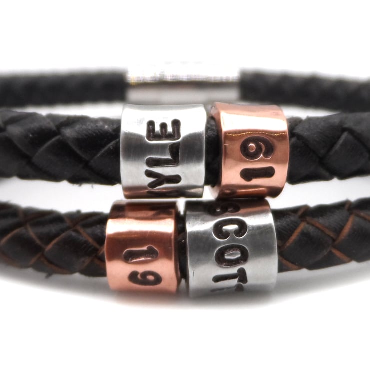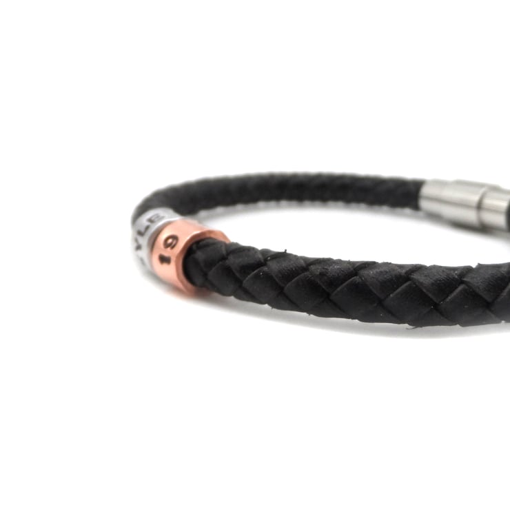The personalised 19th Birthday leather bracelet is made with genuine braided leather that is 6 mm in diameter and has a locking stainless steel connector that ensures that it will not come undone.
