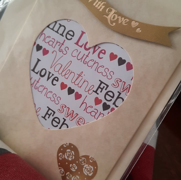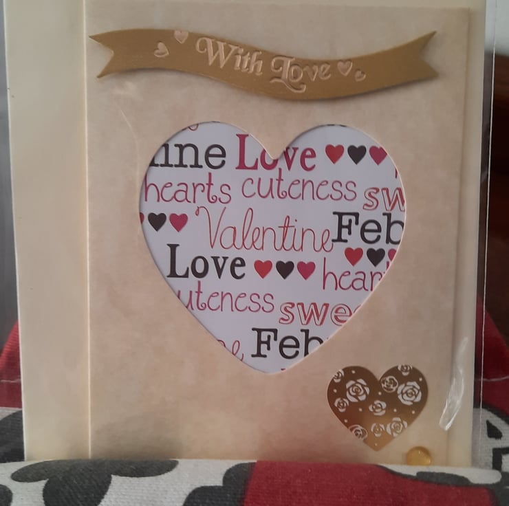 This small cream and gold card measures approx. 8.7cm x 11.3cm and has a heart shaped aperture in the centre. It has the sentiment "With Love" across the top on a ribbon shaped banner. The card is finished off with a gold heart with white roses and a gold coloured sticky gem. The card comes with a cream envelope measuring approx. 11cm x 14.5cm, slightly larger so a little bit of space for popping in a little something extra.