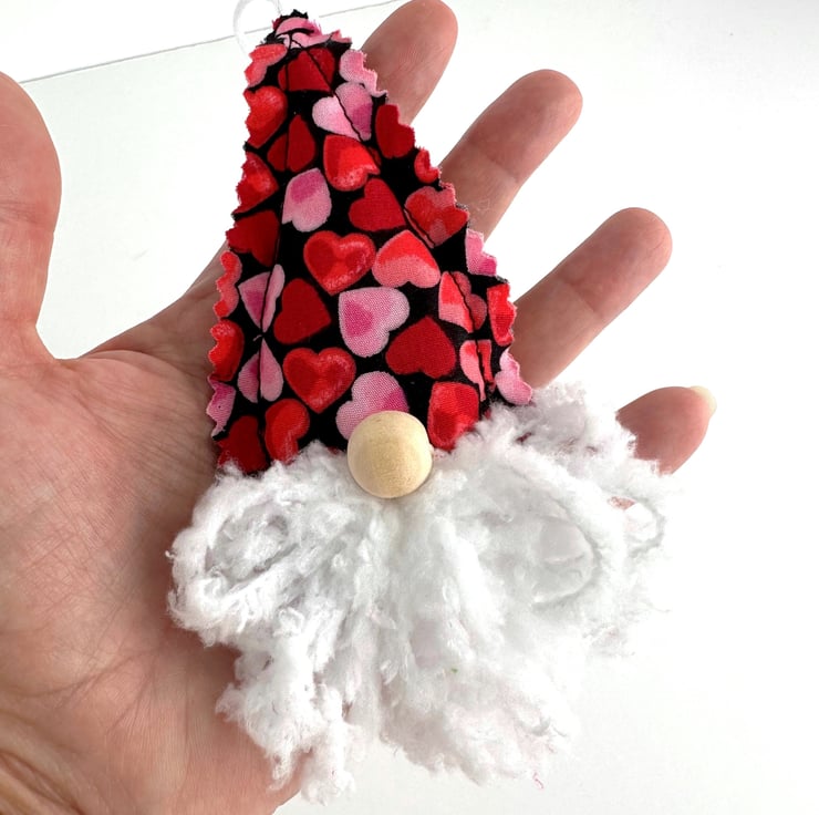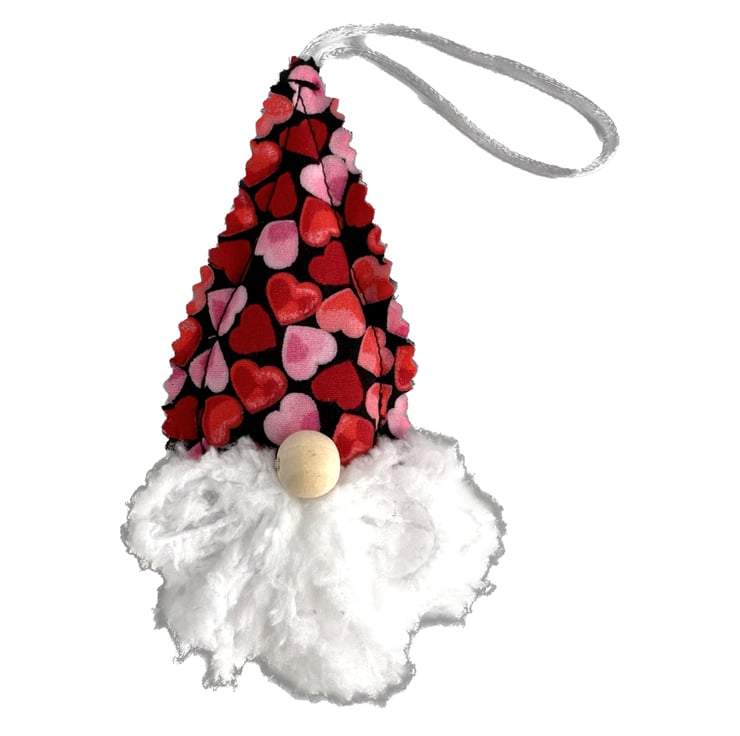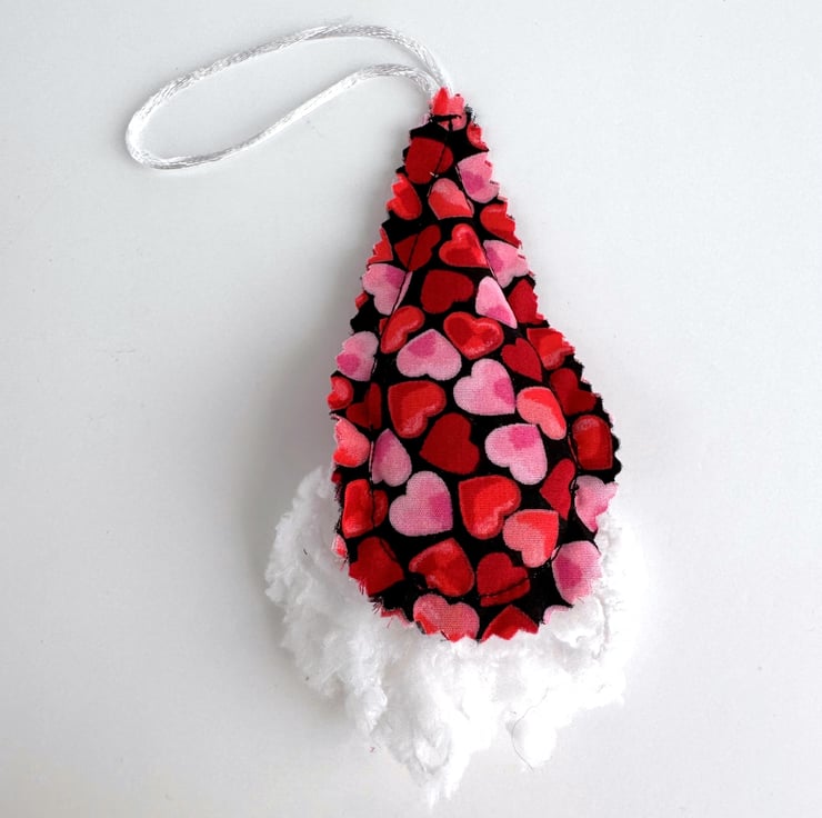 Hearts gnome hanging decoration, St. Valentine’s Day gift. This cute Scandi gnome decoration has a hat of black fabric with a print pattern of red and pale pink hearts. I’ve added a beard made from white snuggly chunky yarn, and a natural wood bead nose. The hat fabric has pinked edges to give a raw scalloped finish. The decoration is lightly padded with polyester hollow fibre filling and has a hanging loop made from white satin cord.
