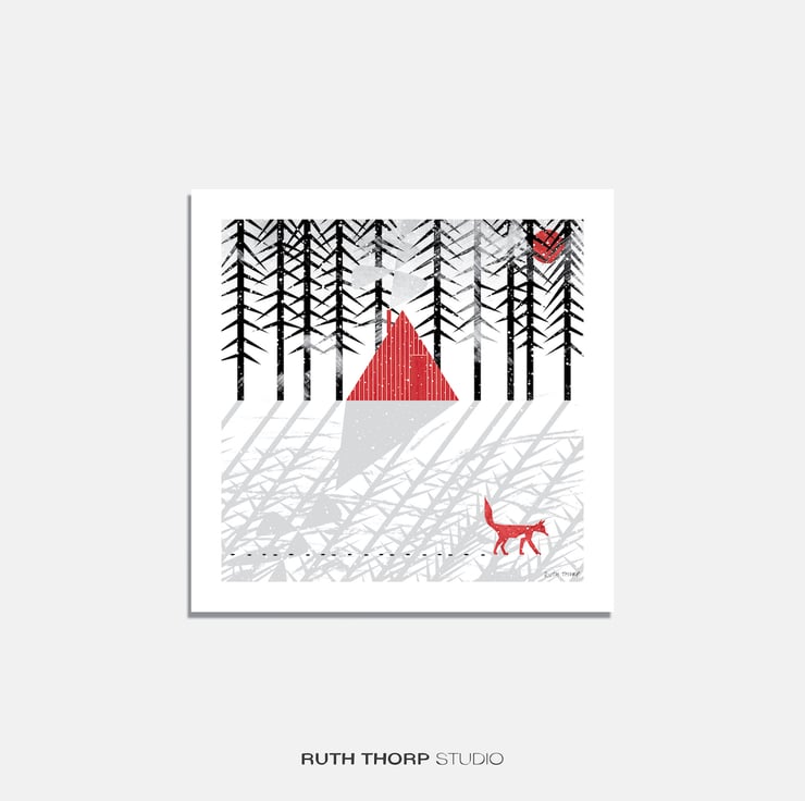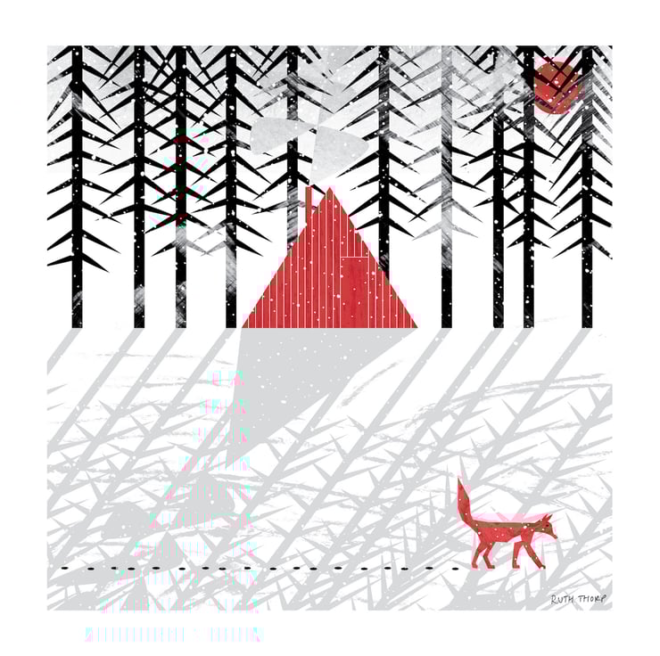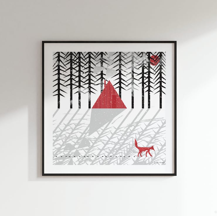 A graphical print featuring a red cabin and fox within a snowy forest scene. Quiet Fox forms part of my Snowfall Collection (see picture of 4 prints as reference). The designs are also available as cards.
