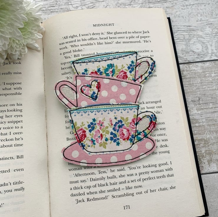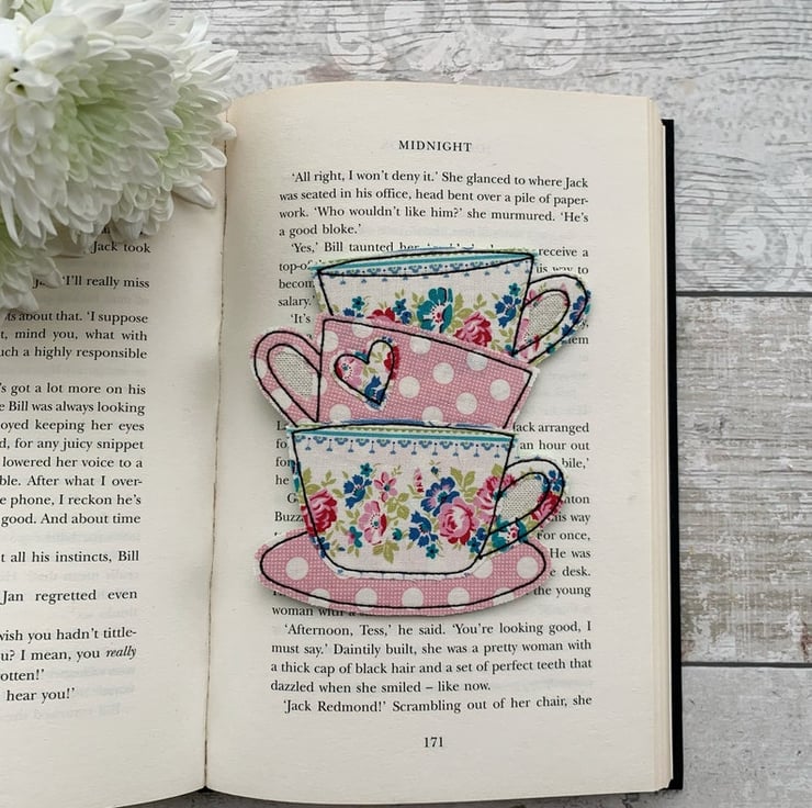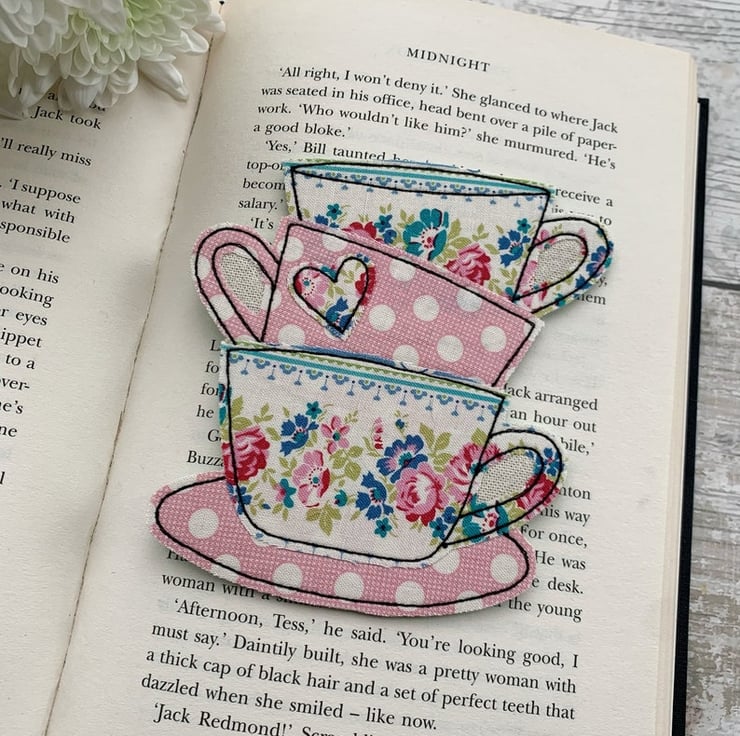 A pretty tea cup stack bookmark made with floral and polka dot fabrics.