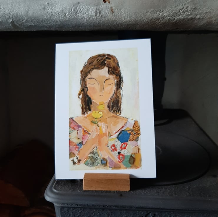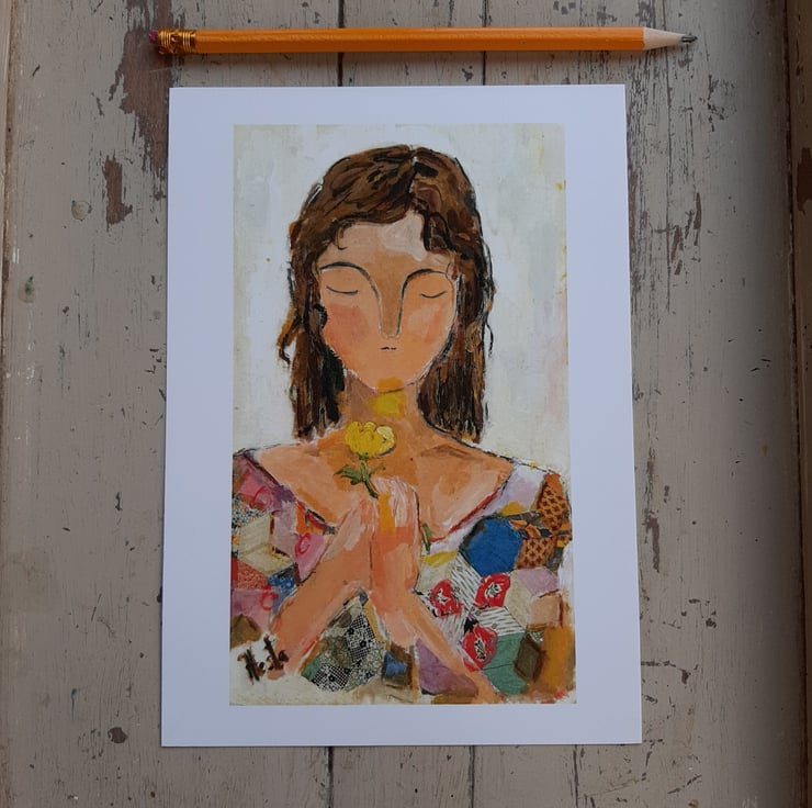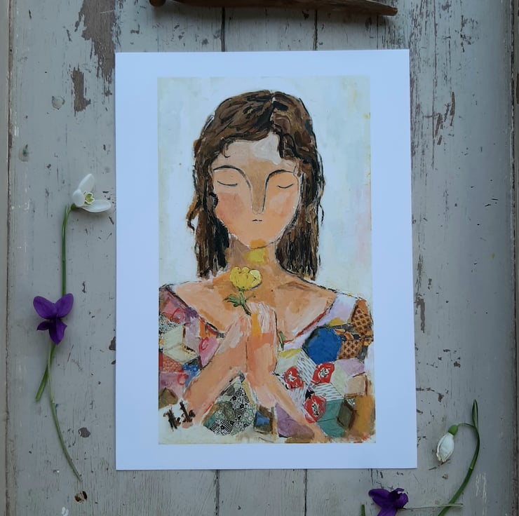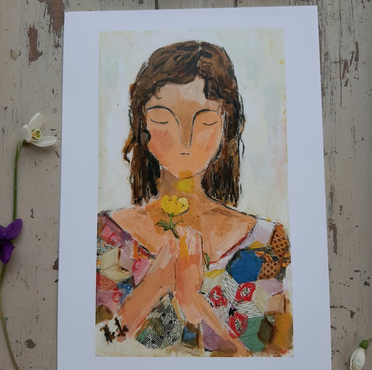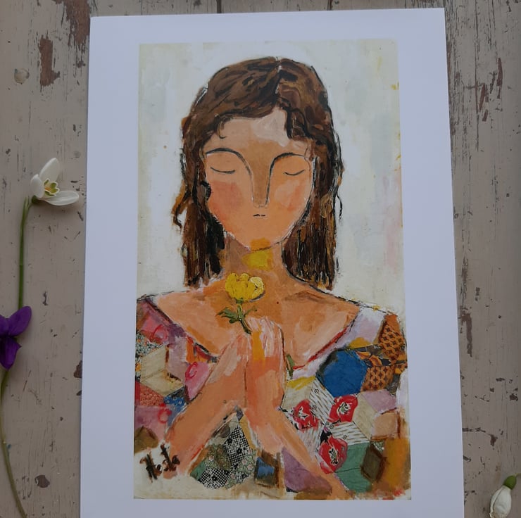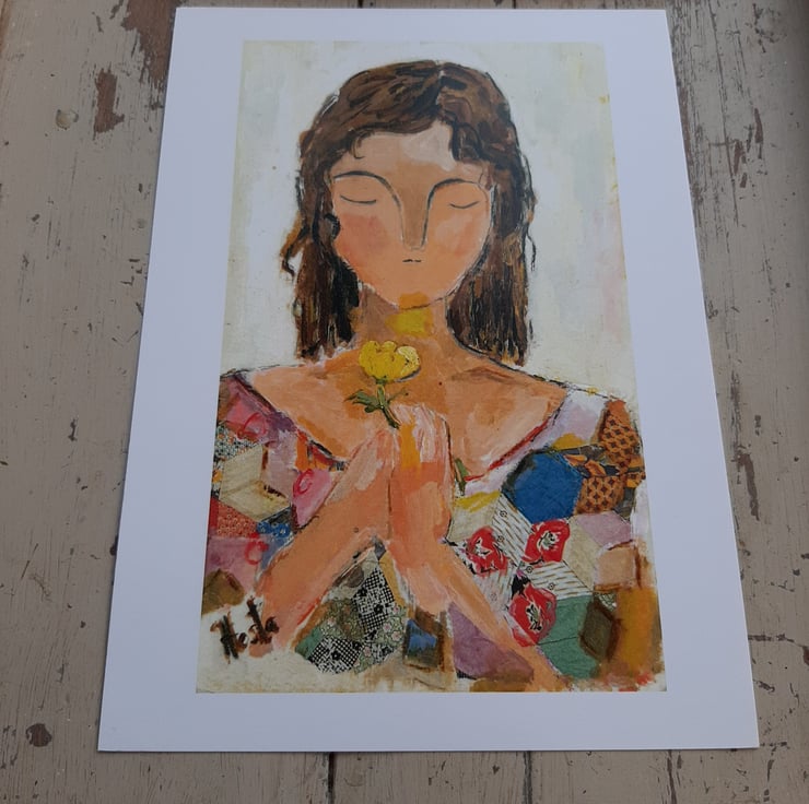 A beautiful print from an original painting by myself. Printed on thick silk smooth paper. Original art work by Hesta Singlewood aka bodkincreates on Instagram. White boarder makes it easyer if you wish to frame her. This print is unframed comes in a biodegradable clear bag and flat box. A thoughtful pose holding her buttercup. Free UK postage