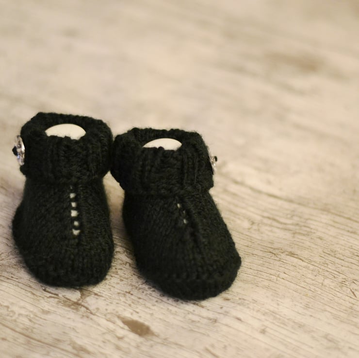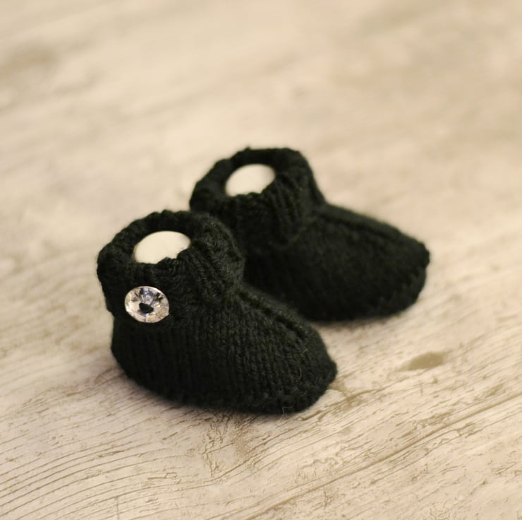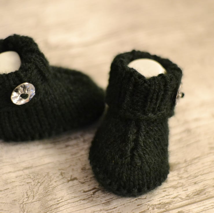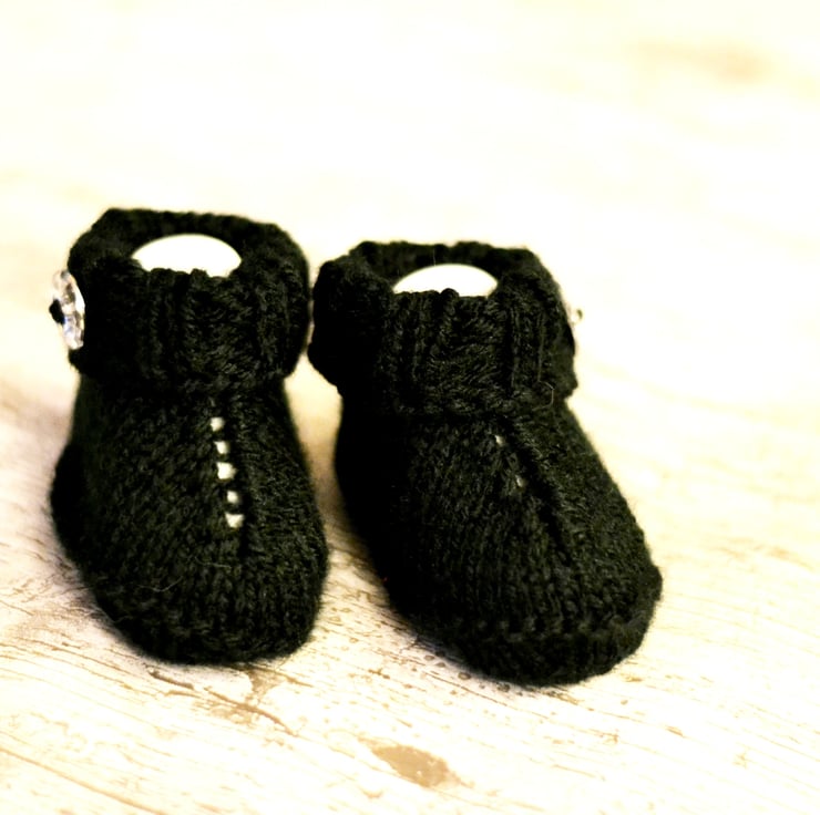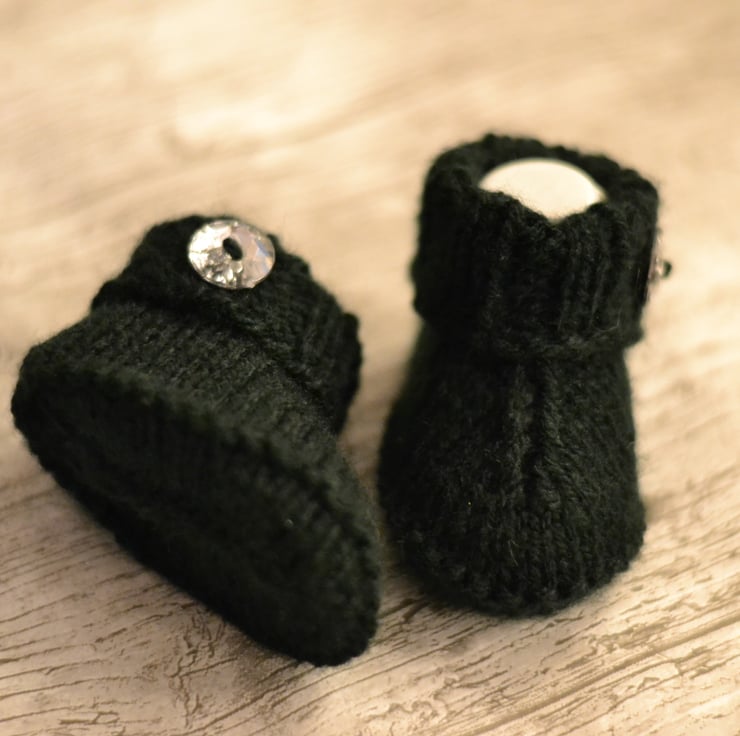 New design. Unisex knitted newborn baby booties. Made in black in 100% acrylic. The girls pair have a clear facteted button sewn at the side and the boys are plain.