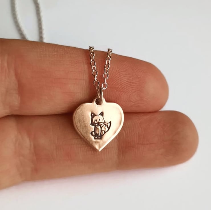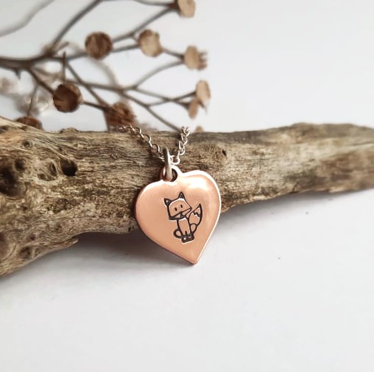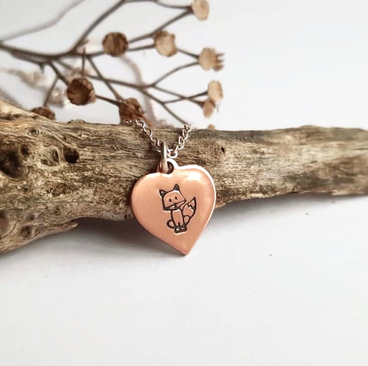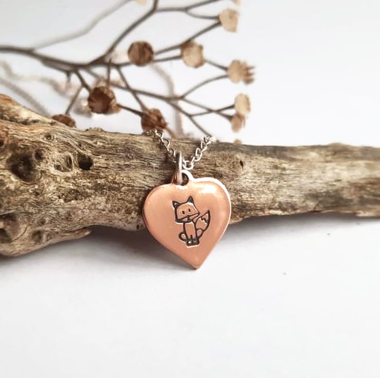 A sweet little pure copper heart pendant, hand stamped with a sweet little fox - perfect for fox lovers!