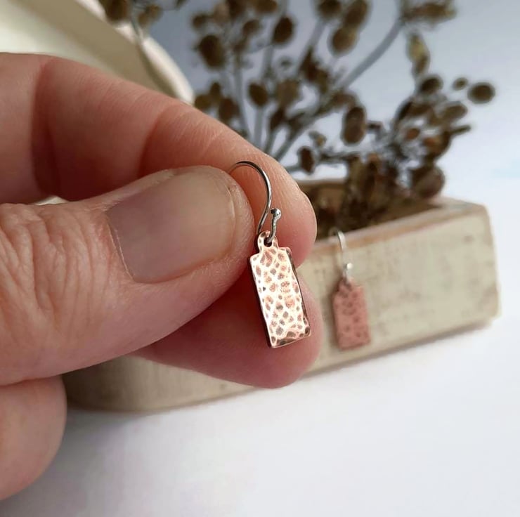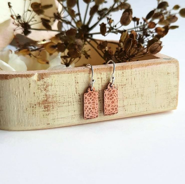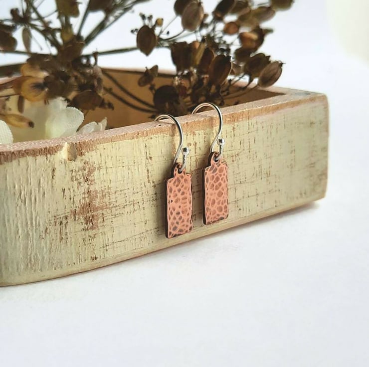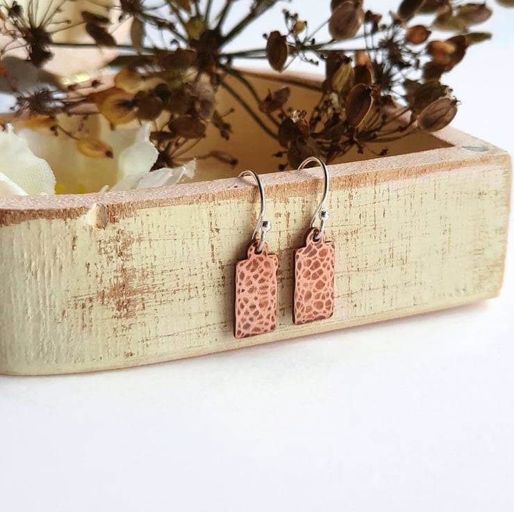 Dainty little rectangular copper charm earrings on sterling silver wires.