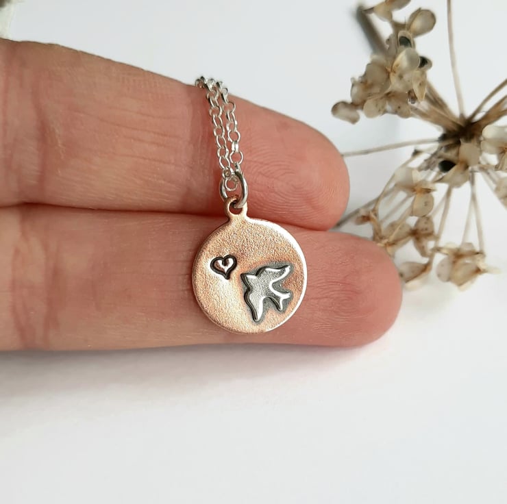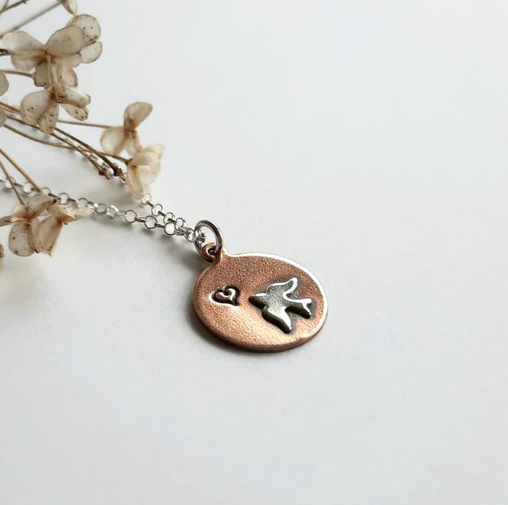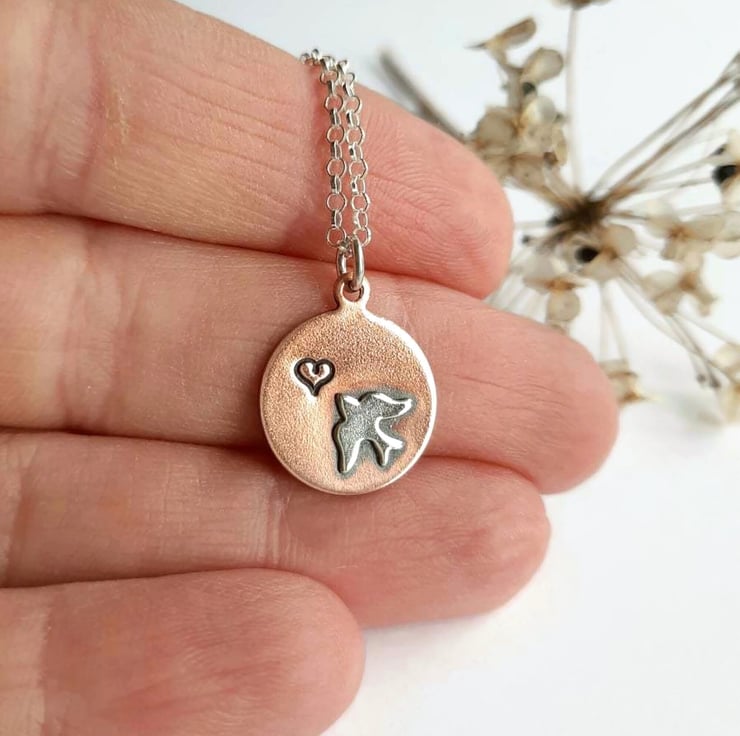 The little copper disc is hand stamped with a tiny heart and a little sterling silver swallow is then soldered into place. The pendant is oxidised with a jeweller's patina to bring out all the lovely details.