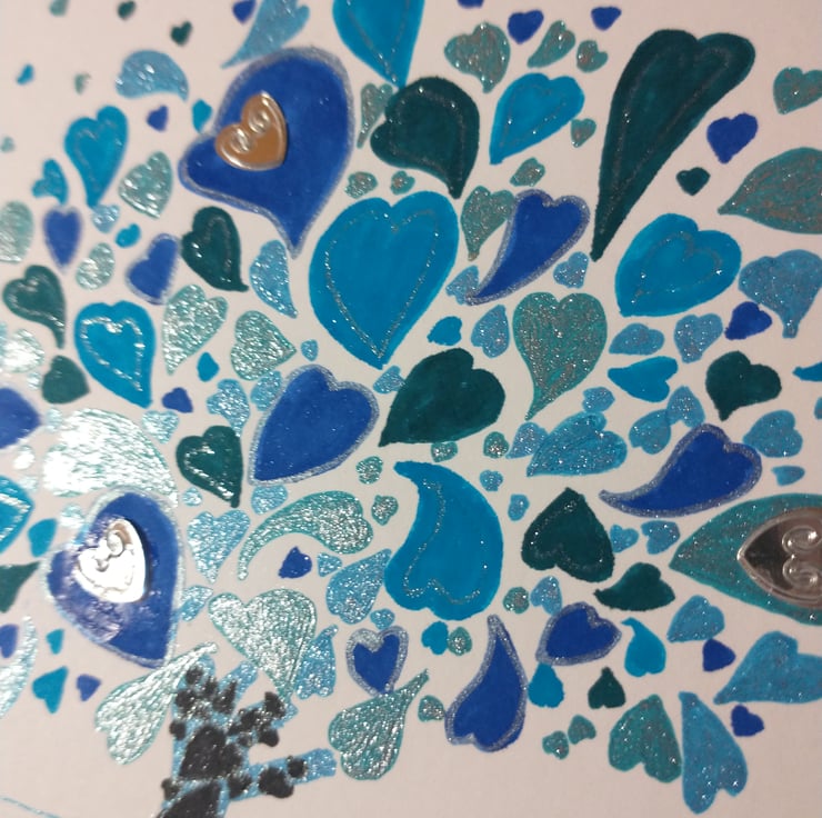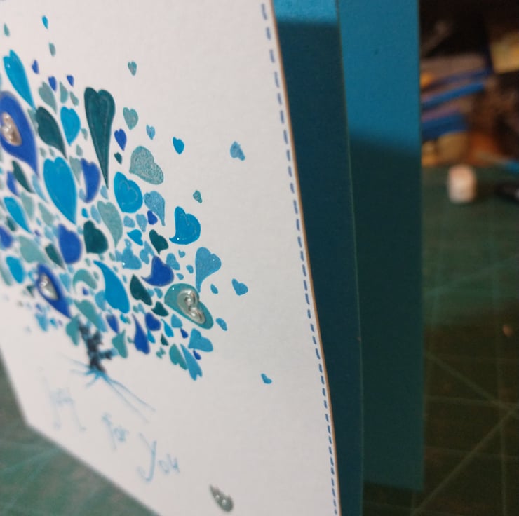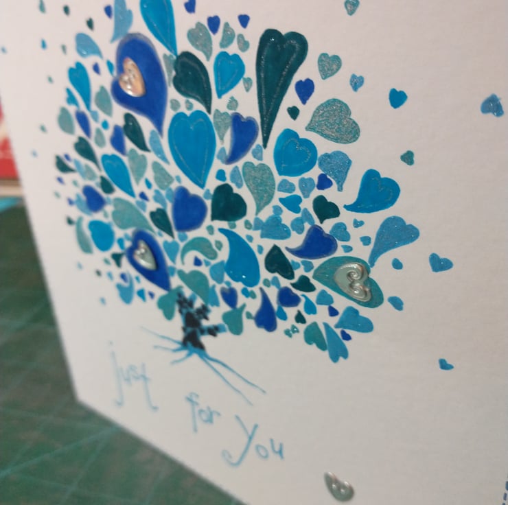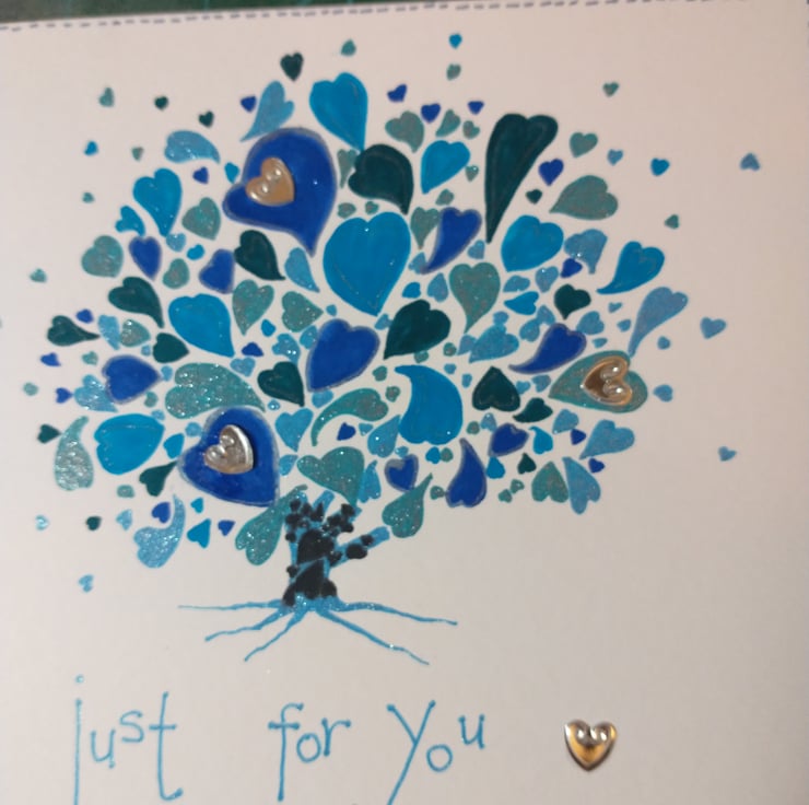 A completely handmade and uniquely designed card. Consisting of a hand drawn and coloured tree made up of hearts. Drawn onto quality pristine white card. Just for you handwritten in blue ink. Embellished with silver hearts