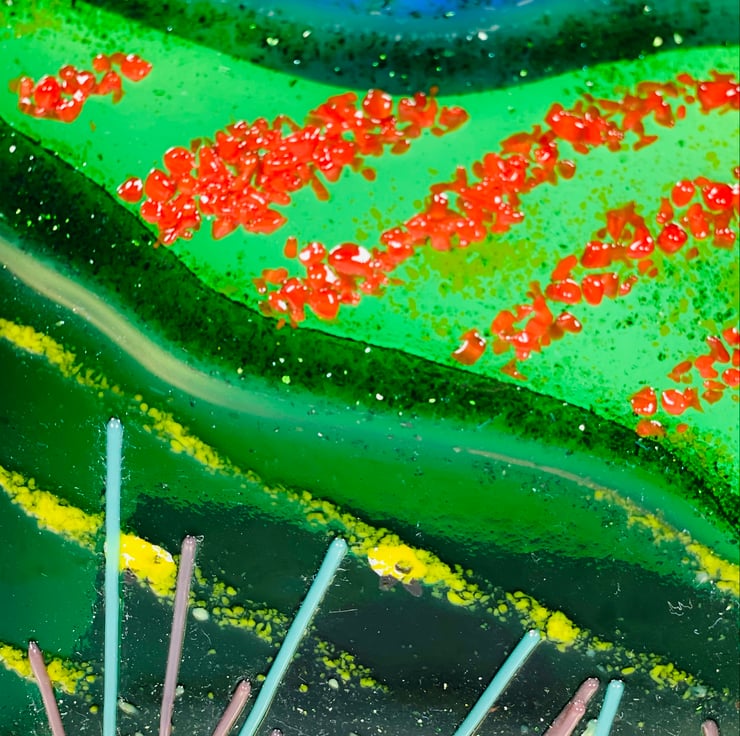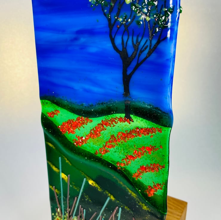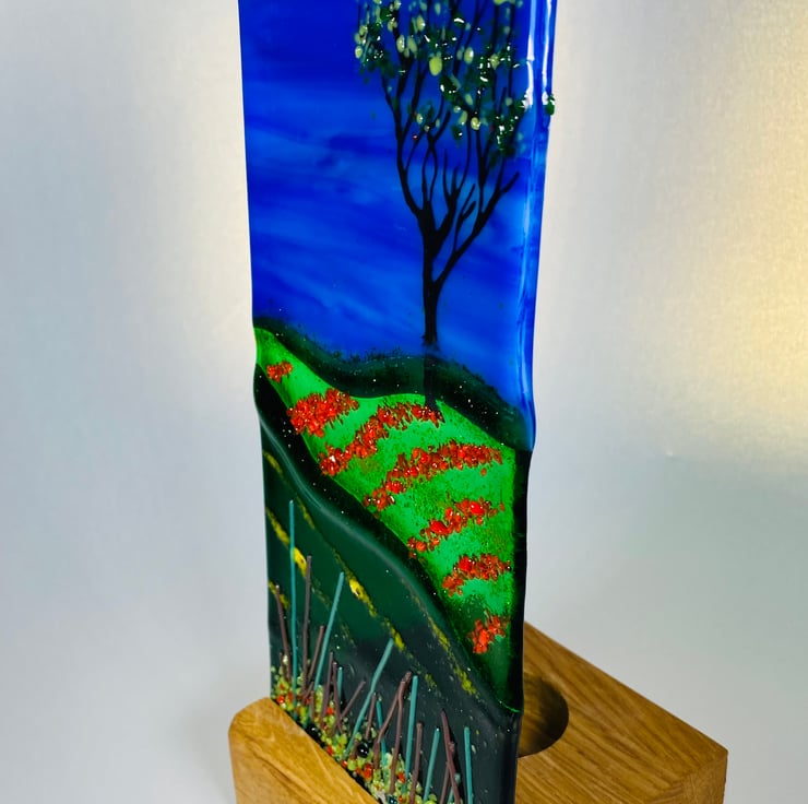 Gorgeous fused glass contoured and colourful depiction of fields near my home in Devon . Full of colour this lovely panel can be back lit with a t light candle . The glass has subtle sparkle within the greenery . . The glass art slots neatly into an oak base which can easily be removed for cleaning and transportation. It’s a wonderful piece . Thanks so much for looking Lou x