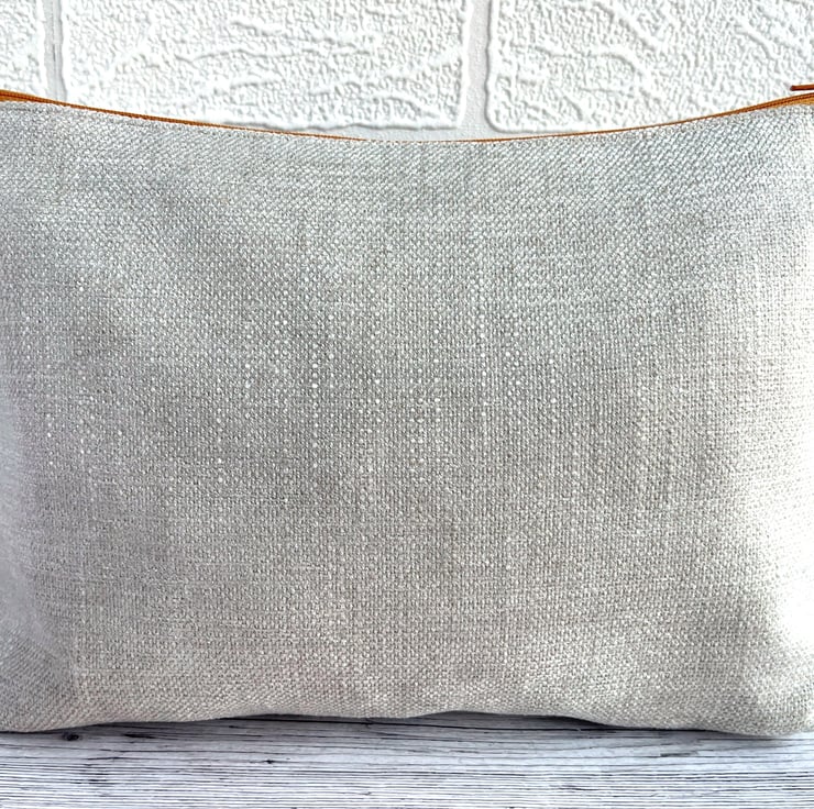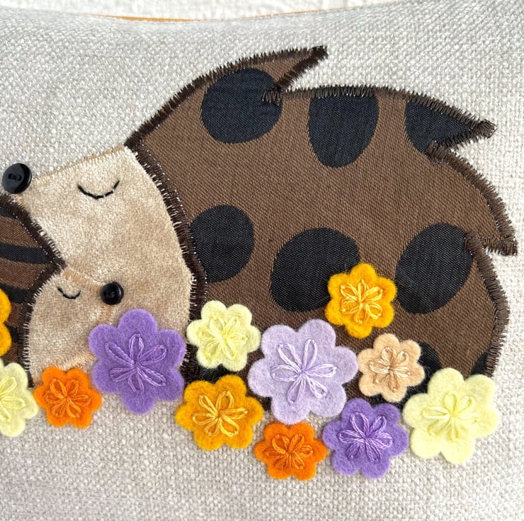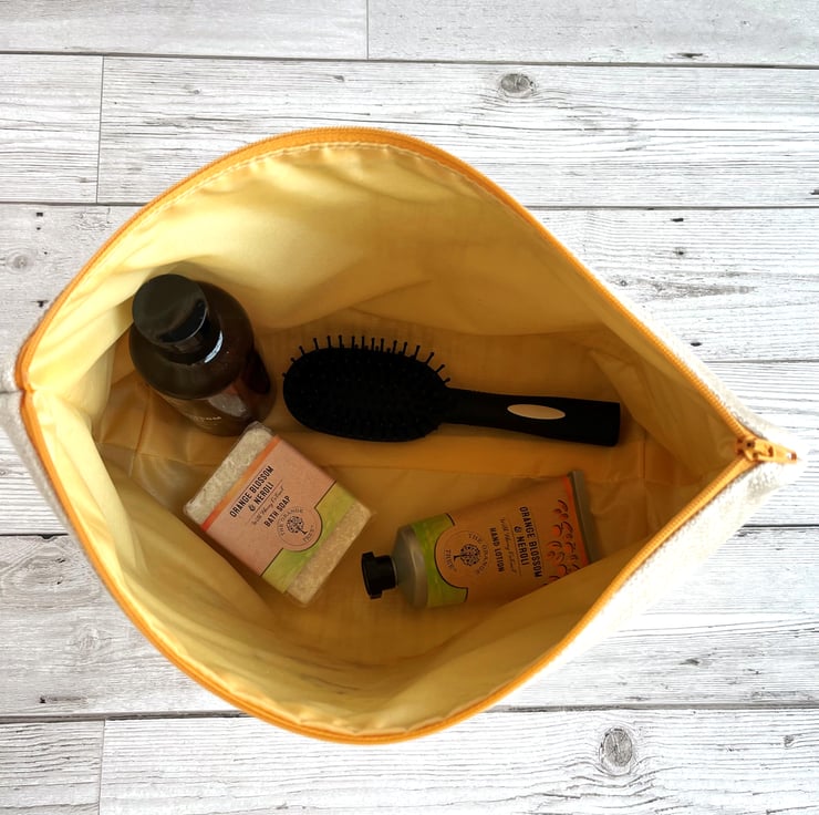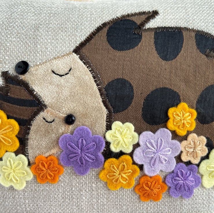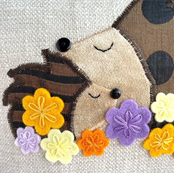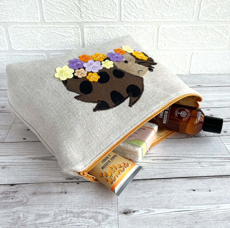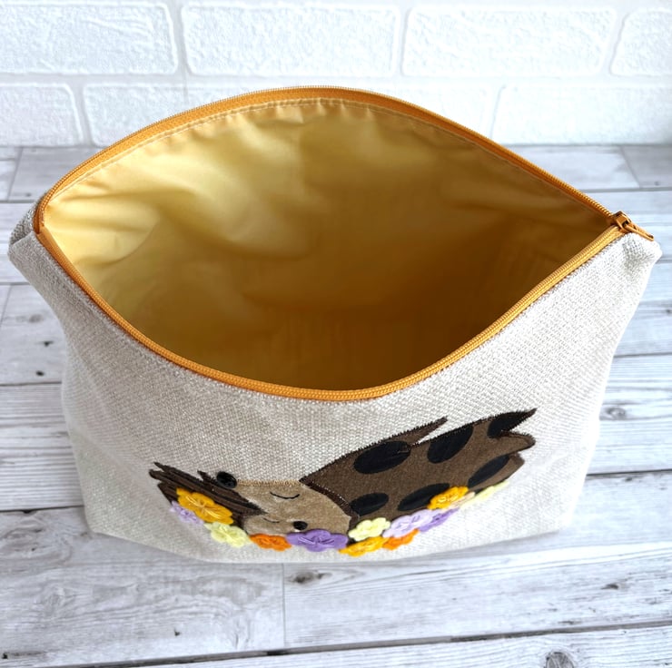 Hedgehogs and flowers toiletry bag. This cute toiletry bag is made from cream fabric, and has an appliqué design featuring two cute hedgehogs, a mother and baby, sitting amongst spring flowers. The mother hedgehog is made from brown fabric with large black spots. The baby hedgehog is made from matching fabric with brown and black curved stripes. They each have a beige velvet head, black button nose, and black hand embroidered sleepy closed eyes. The hedgehogs are sitting amongst felt flowers in shades of purple, yellow and orange. Each flower is attached by a hand-embroidered lazy daisy. The bag fastens with a golden yellow zip and is lined with golden yellow water-resistant fabric. The base of the bag is boxed to give lots of space for all those essential items.