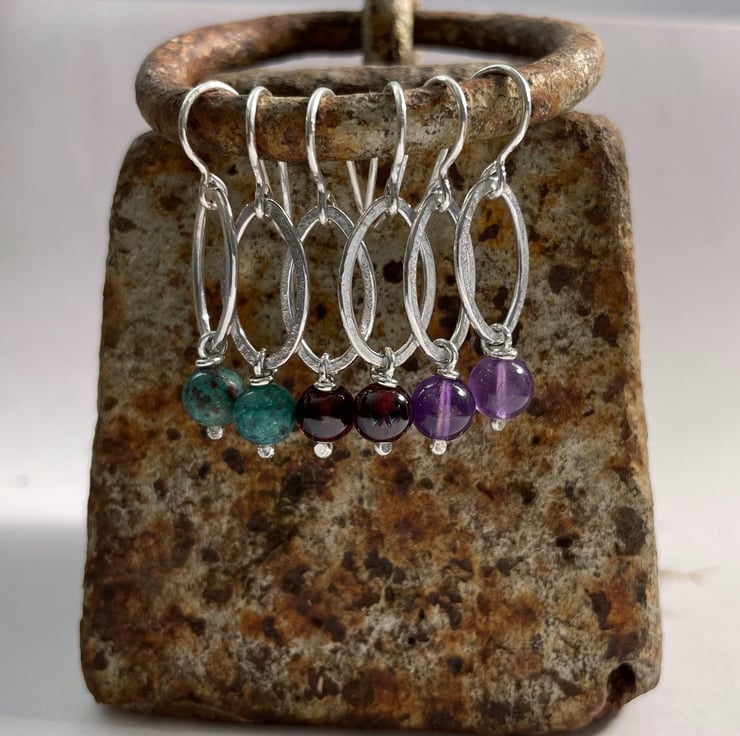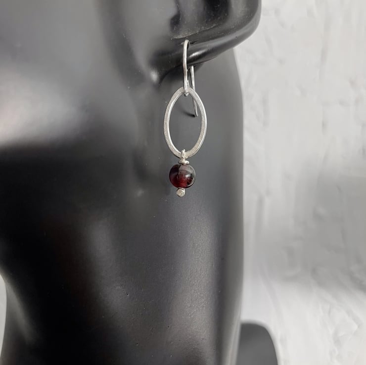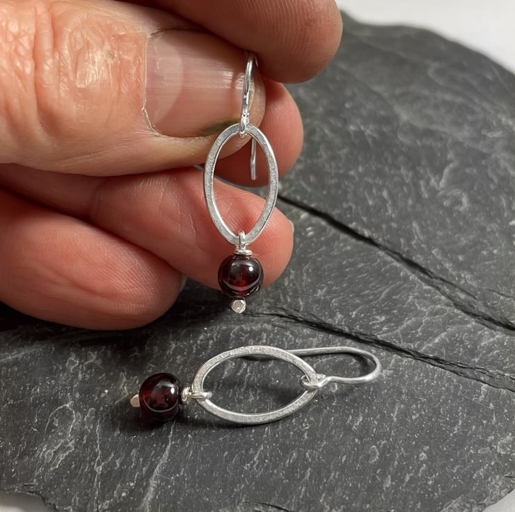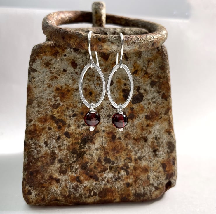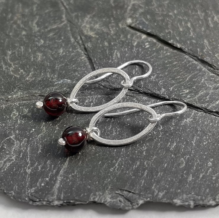 Sterling silver hammered oval drop earring with garnet. Hung from handmade hooks