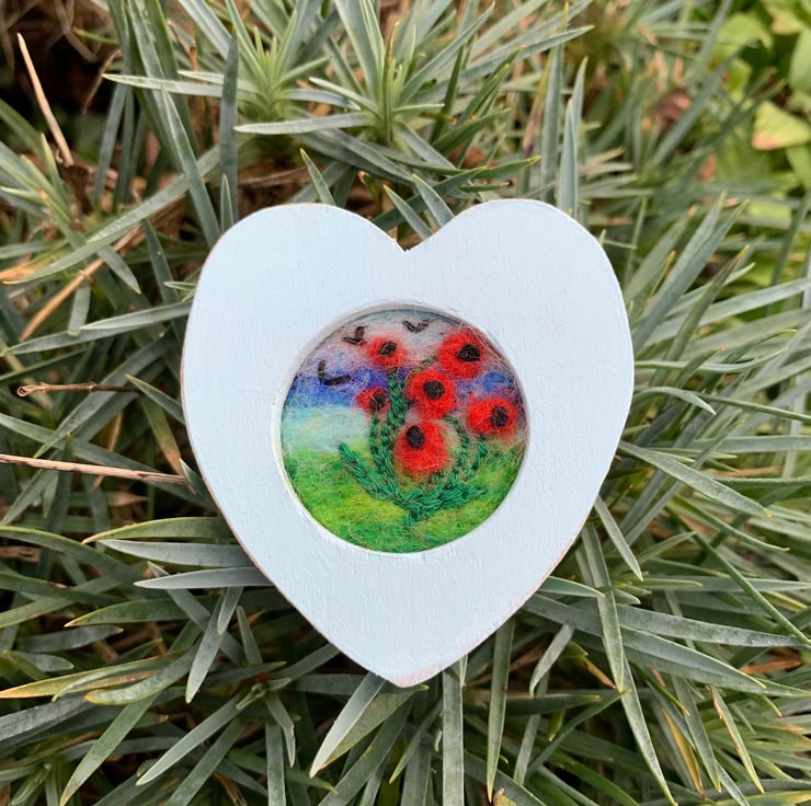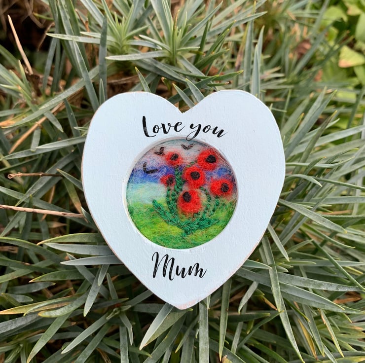 A hand made wooden heart fridge magnet incorporating a tiny needlefelted and embroidered picture of poppies in a field. Can have the words ‘love you Mum’ or anything similar (within reason due to size ) or can be left blank. Each needlefelted picture will be slightly different as with all handmade items.