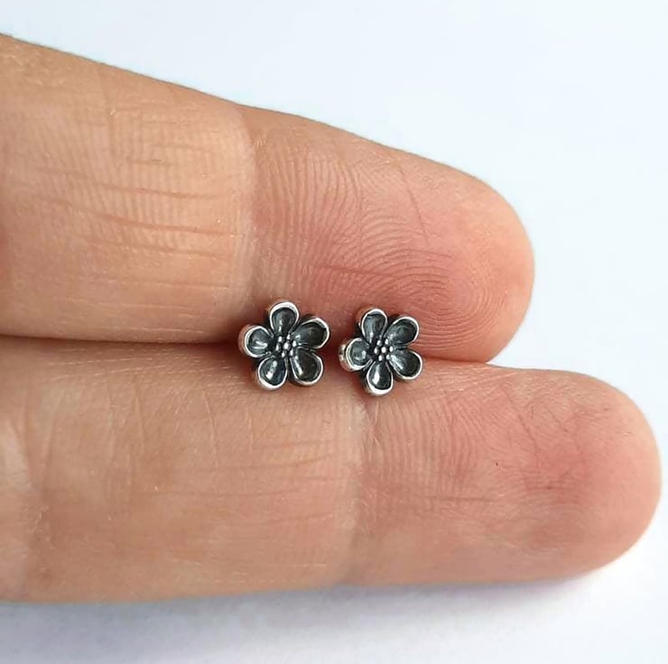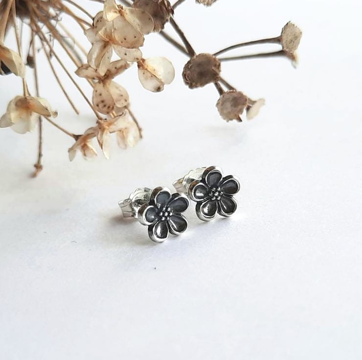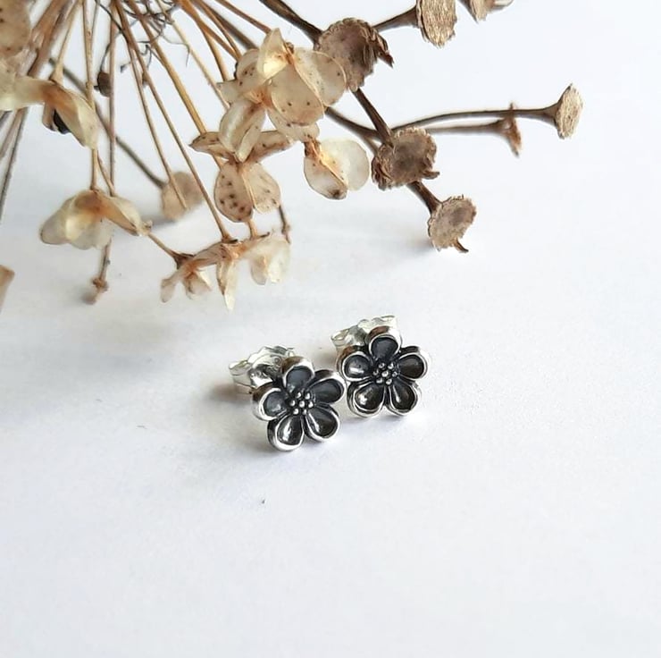Small Silver Forget Me Not Flower Stud Earrings - Oxidised Fine Silver