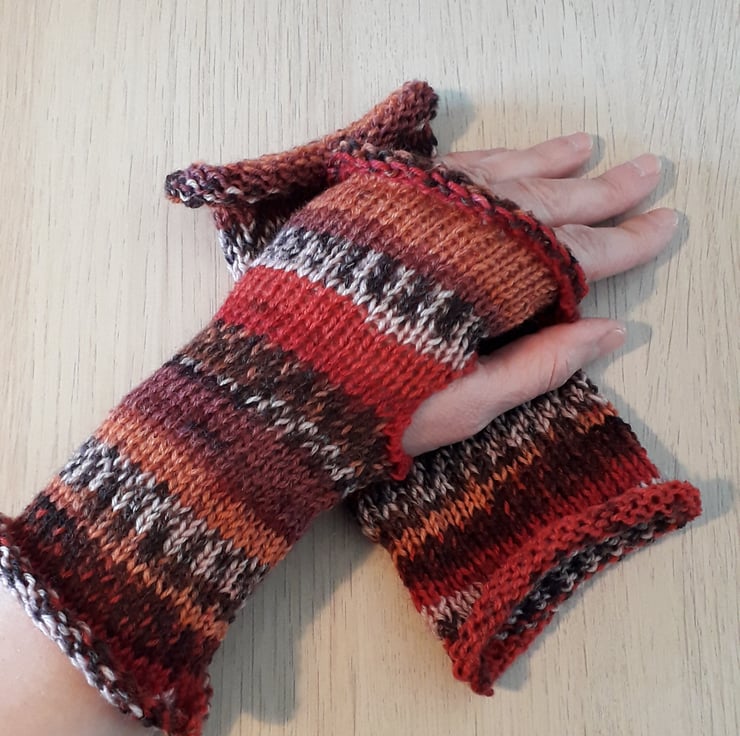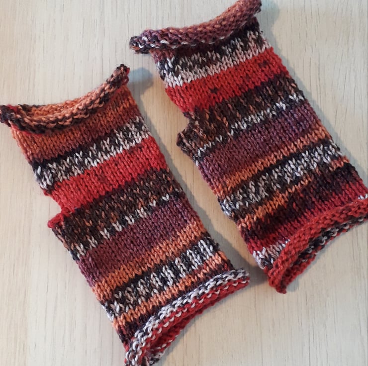 These wristwarmers will keep you warm and cosy throughout the year. They feature rolled edges at both ends, and should fit most adult hands.