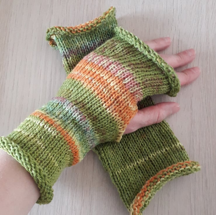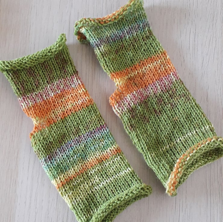 These wristwarmers will keep you warm and cosy throughout the year. They feature rolled edges at both ends, and should fit most adult hands.
