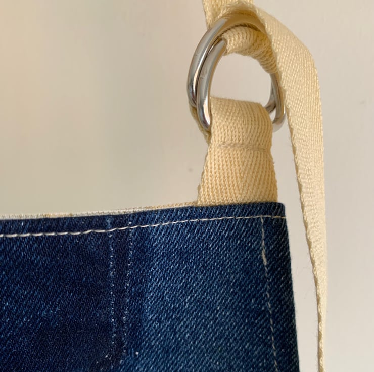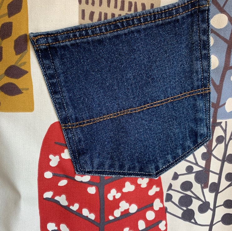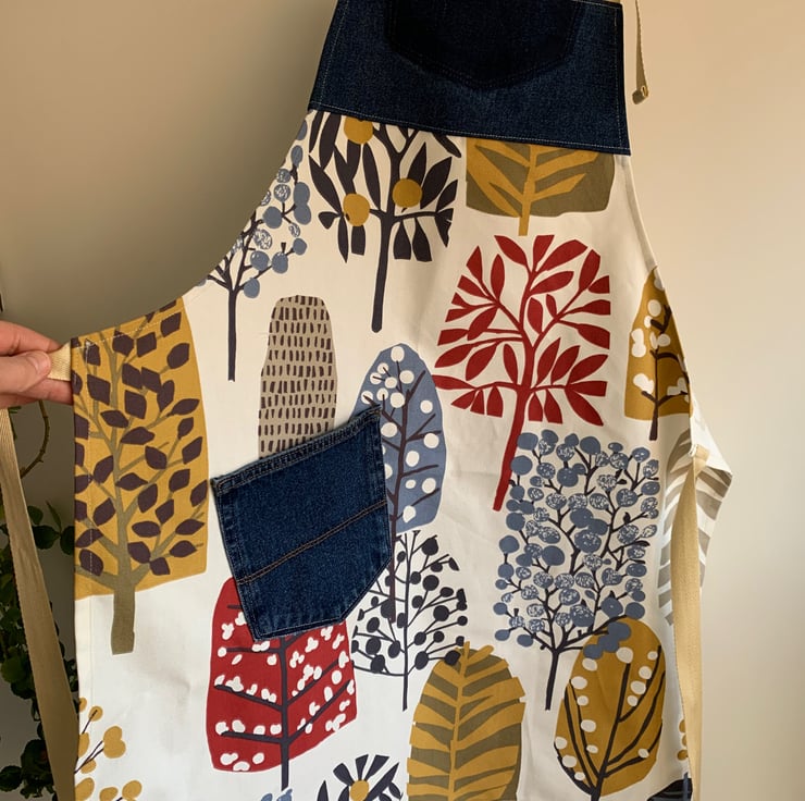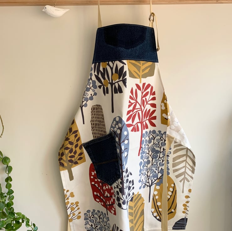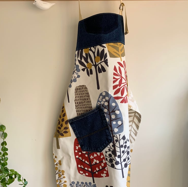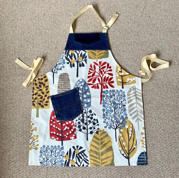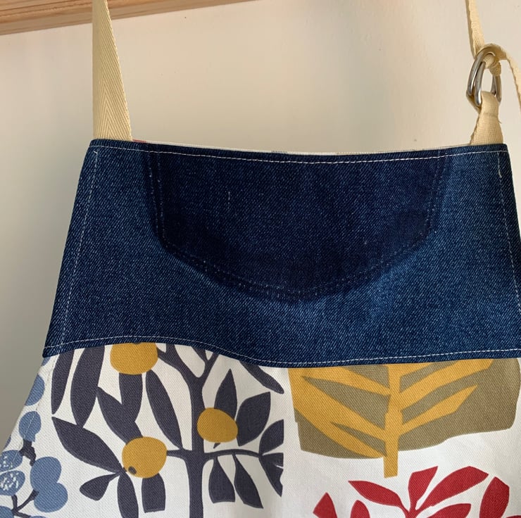 Colourful apron made from Clarke and Clarke Trad cotton with the pocket and denim trim from an old pair of jeans. The straps are strong cream webbing.