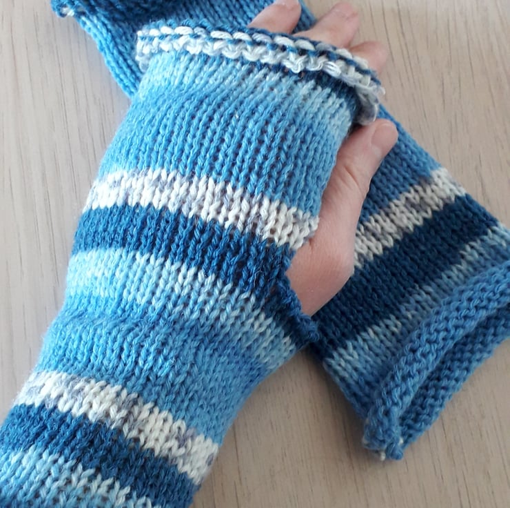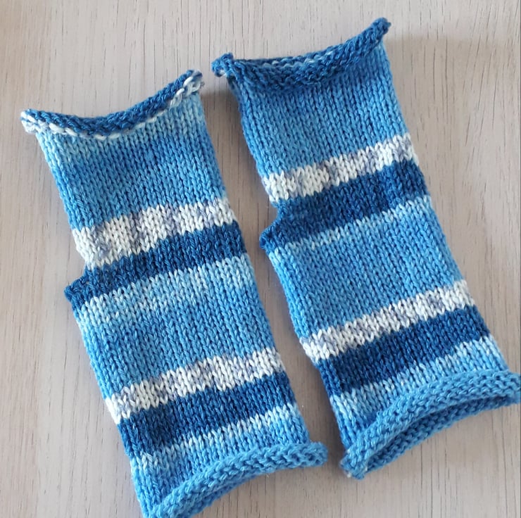 These wristwarmers will keep you warm and cosy throughout the year. They feature rolled edges at the top, and a ribbed cuff with plenty of stretch, and should fit most adult hands.