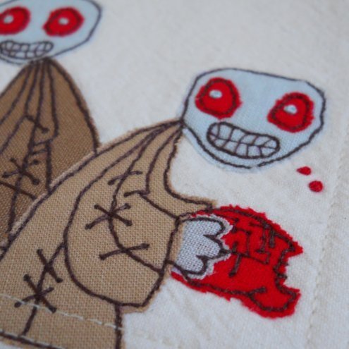 the zombies are cut from cotton fabric and appliqued onto pre-washed calico. they are then "drawn" on with free machine embroidery, and features hand embroidered eyeballs and blood.