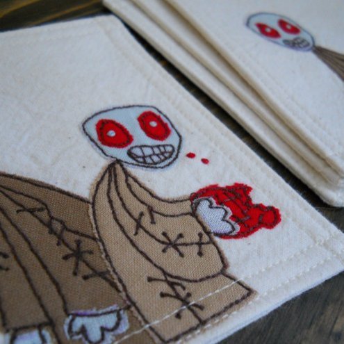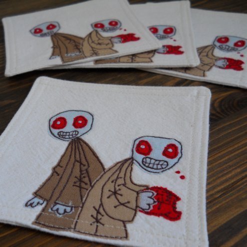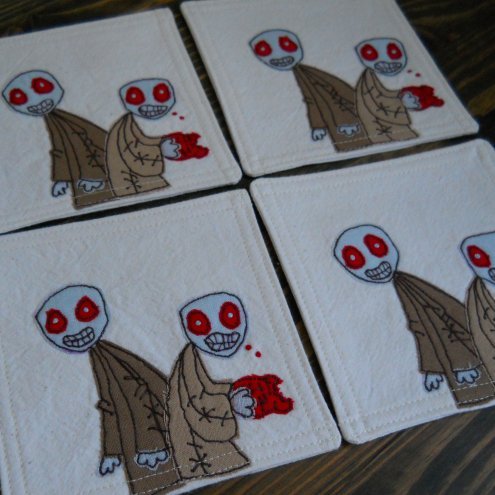 set of 4 embroidered calico coasters, featuring scary zombies eating brains.