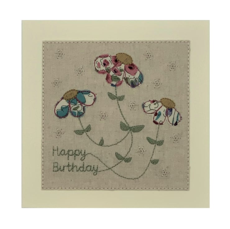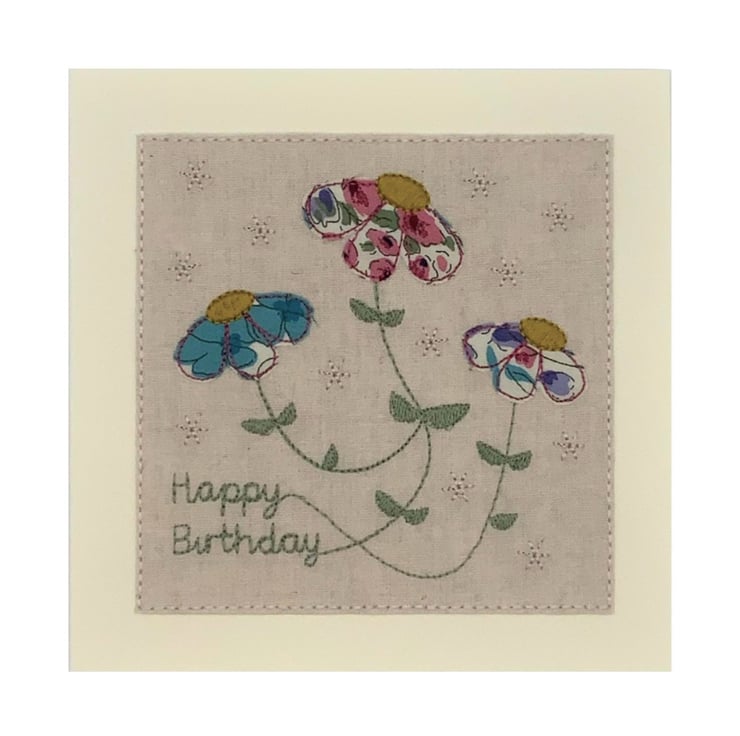 This is an embroidered textile card made from Liberty Tana Lawn printed Cotton on a base of Natural Linen, mounted onto a Cream card.