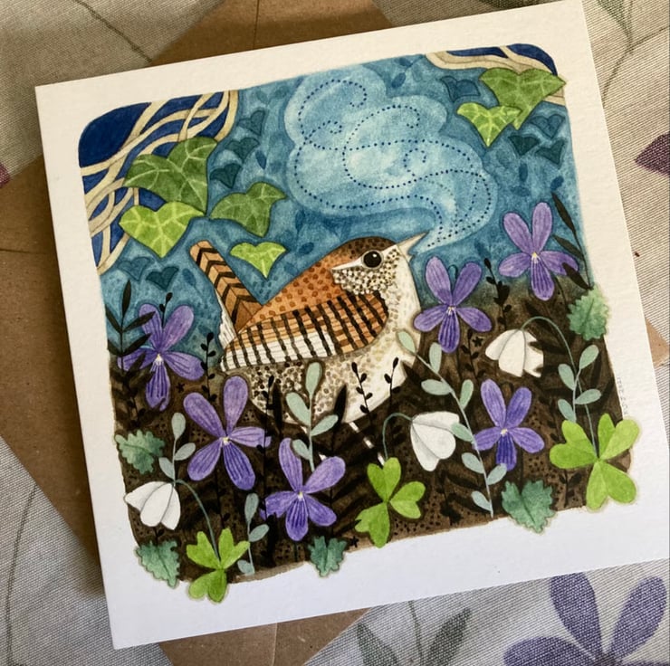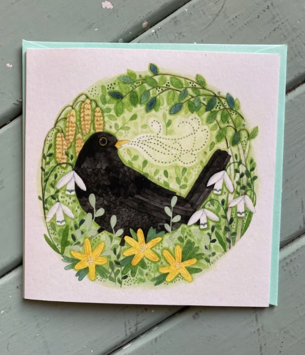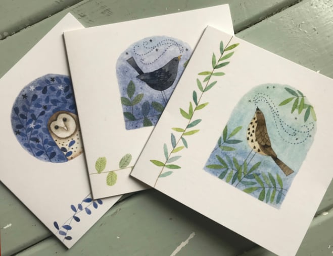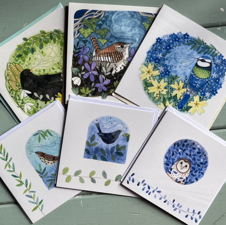 A collection of six bird designs, blank inside and supplied with envelope. Wren and Blue Tit are 12.5cm square, Thrush. Owl and Blackbird are just under 11cm square. From original designs by Three Acorns.