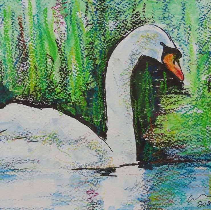 Original watercolour, ink and Inktense crayons painting on acid free 300gsm acid free watercolour paper of a very cute swan!