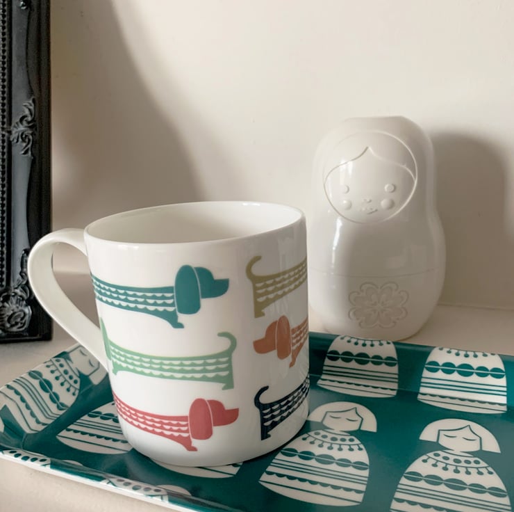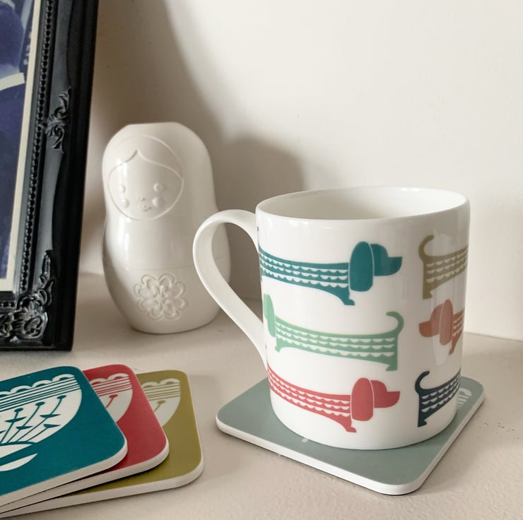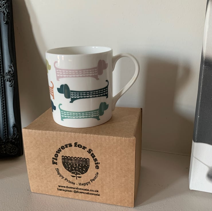 The sausage dog design was inspired by all the little sausage dogs who walk along the beach near my home. My son is desperate to get one but we can have one so I made him a print instead. As with all my designs, the Sausage Dog mug design was created in my little studio by the sea; starting life as sketch, then developed as a lino print and finally digitally crafted to create the unique Flowers for Susie colour palette.