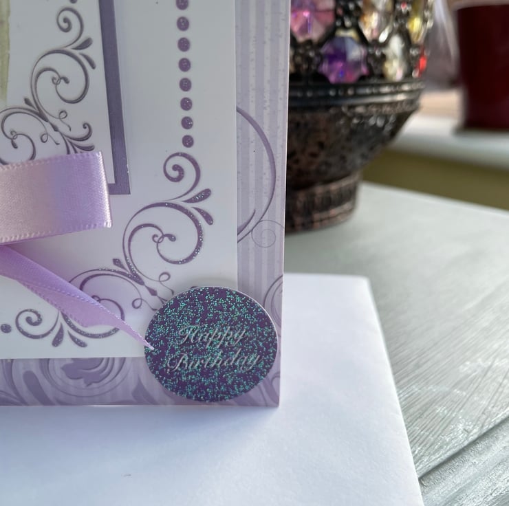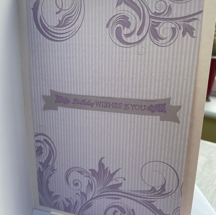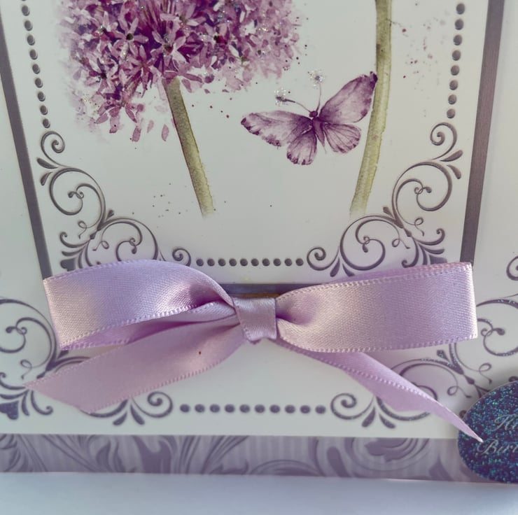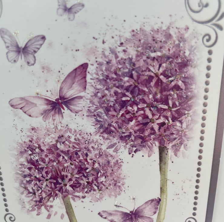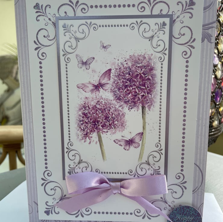 Soft and feminine with delicate hydranger blossoms, this card is a lovely way to send birthday wishes. This approxiamtely A5 card has a lilac swirl background paper. This si topped witha white and lilac swirl card. The main design has a matching silver swirl frame and 2 hydranger blossoms. The design is complimented with butterflies. A satin ribbon bow adds a bit more femininity and a glitter happy birthday disc sits in the corner. Inside has a matching paper insert with birthday wishes to you as a greeting.