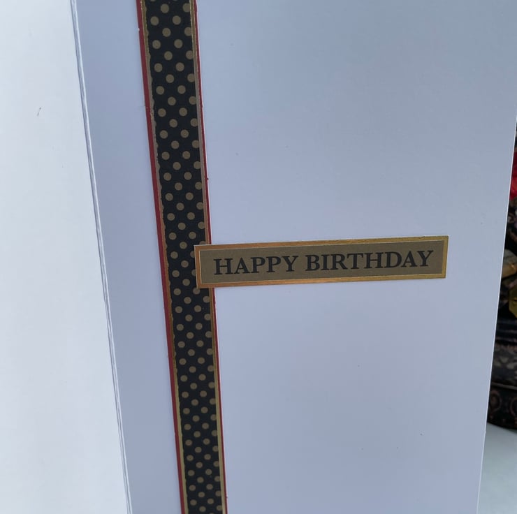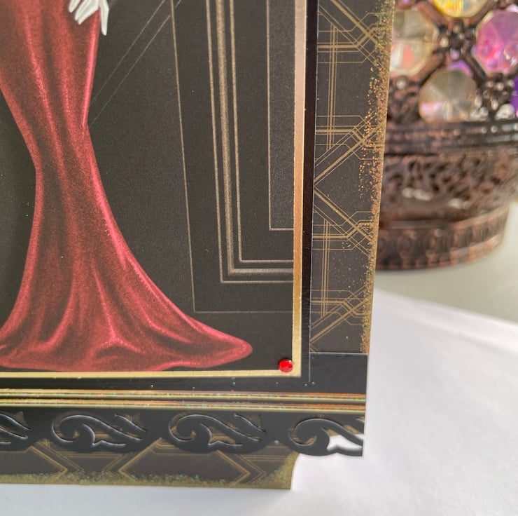 Dark and sultry mysterious Art Deco lady label shaped birthday card. This DL size card features a lady in a red slinky dress, she is looking over her shoulder, she has a feather headdress and long white gloves. A very glamorous figure. The background is black and muted gold in geometric patterns. The edge has a holographic glitter embossed edge. There is a die cut swirl edge at the bottom. Inside has the greeting Happy birthday.