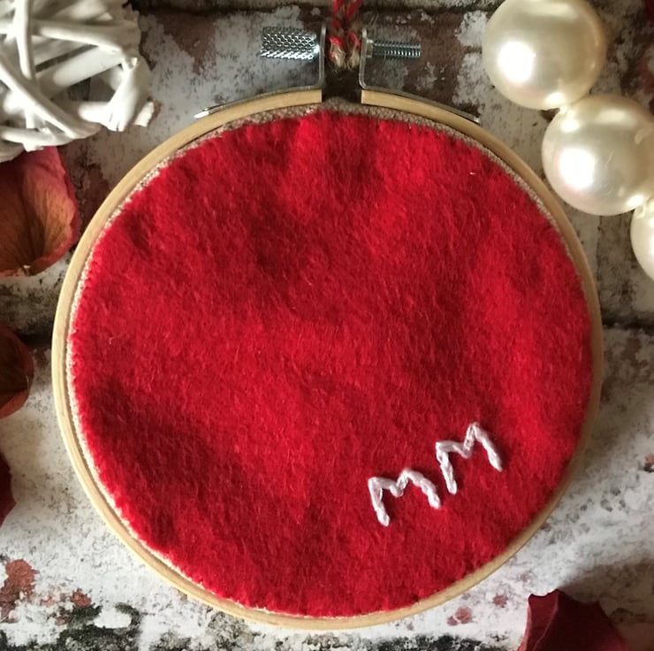 This hoop has a single hand embroidered red thread heart, with a beautiful decorative piece of ribbon of mini red roses and green loops, hand sewn through, the word ‘love’ hand embroidered in green thread, with tiny embroidered red ‘sprinkle’ stitches scattered on the linen mix background. It is finished on the back with a hand stitched circle of red felt and the initials MM embroidered in white, identifying the maker ‘MuddMade’ and hangs with a plaited loop of natural jute and red embroidery thread.