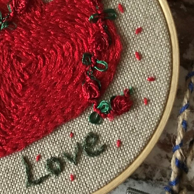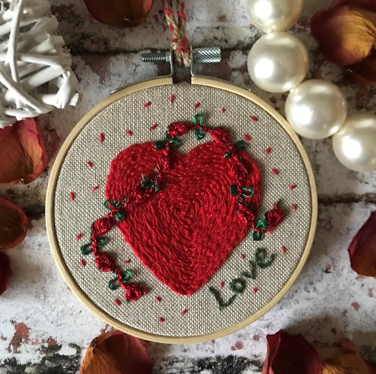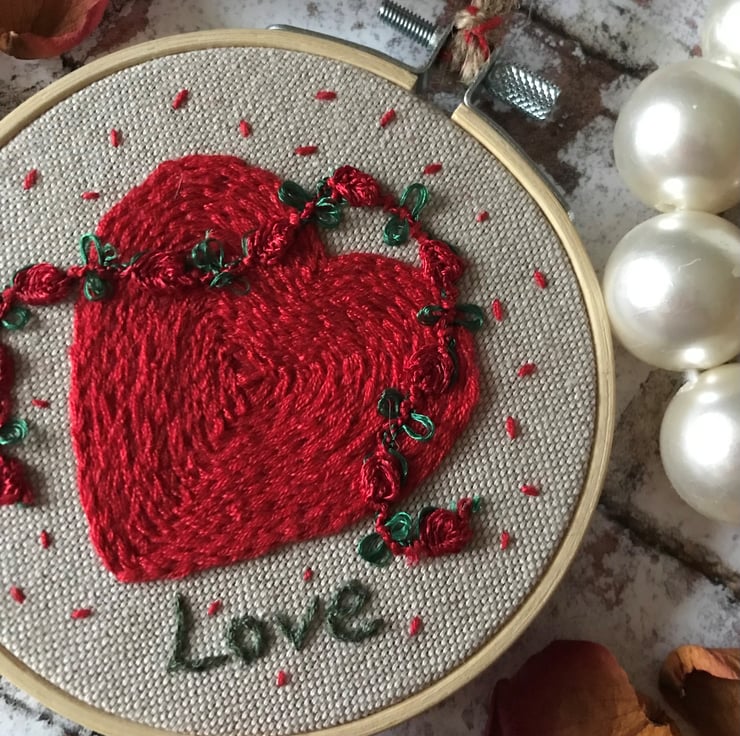 My own design ‘Love Heart’ embroidery art framed on a 4” bamboo hoop.