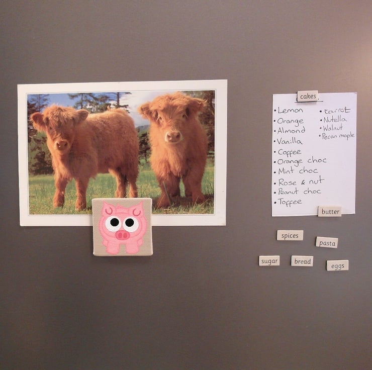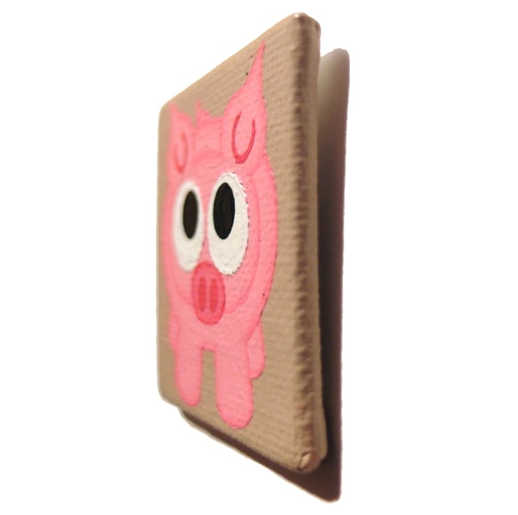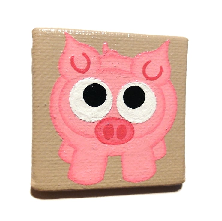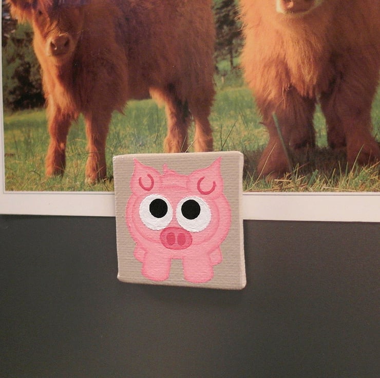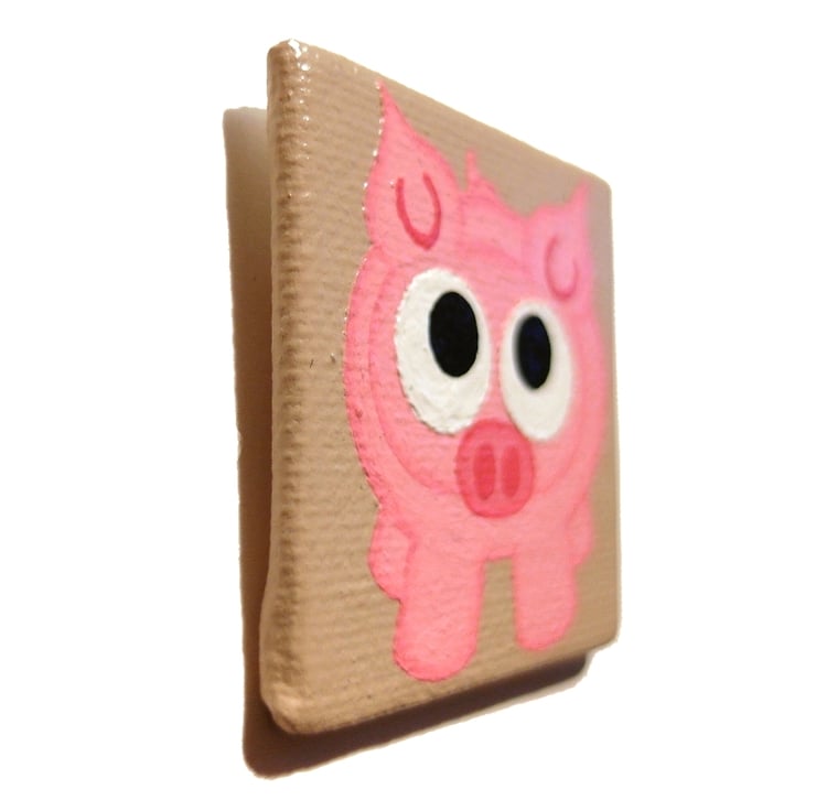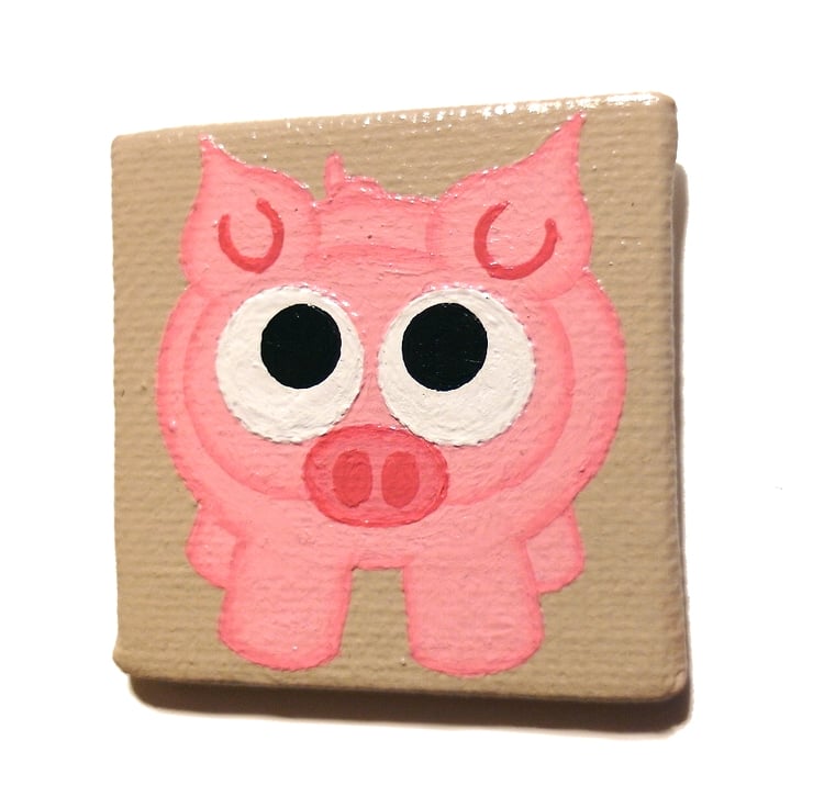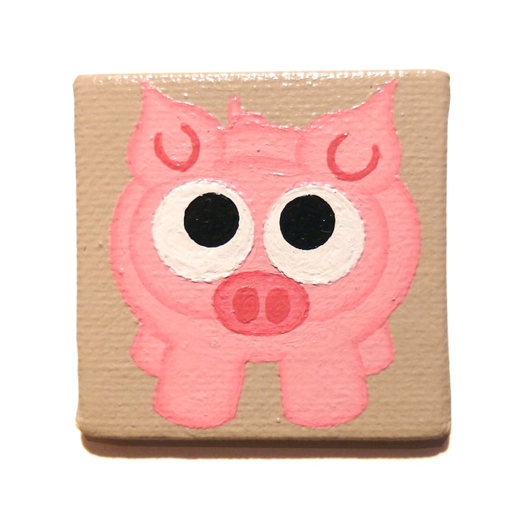 This cartoon pig art is painted in acrylics on a mini 5cm x 5cm (2" x 2") canvas board, and has been coated with a layer of clear varnish to make it more durable. A 12mm magnet is attached to the back so the little painting can stick on a fridge or other magnetic surface.