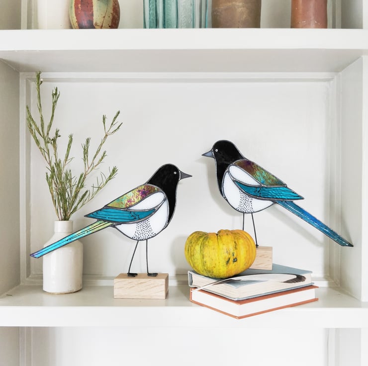 Beautifully illustrated and handcrafted in stained glass this little suncatcher would make a gorgeous, fun addition to any home. Whether displayed on your favourite shelf or shinning bright in front of your window. This little bird is a great way to introduce some colour and create a more contemporary, curated space within your home.