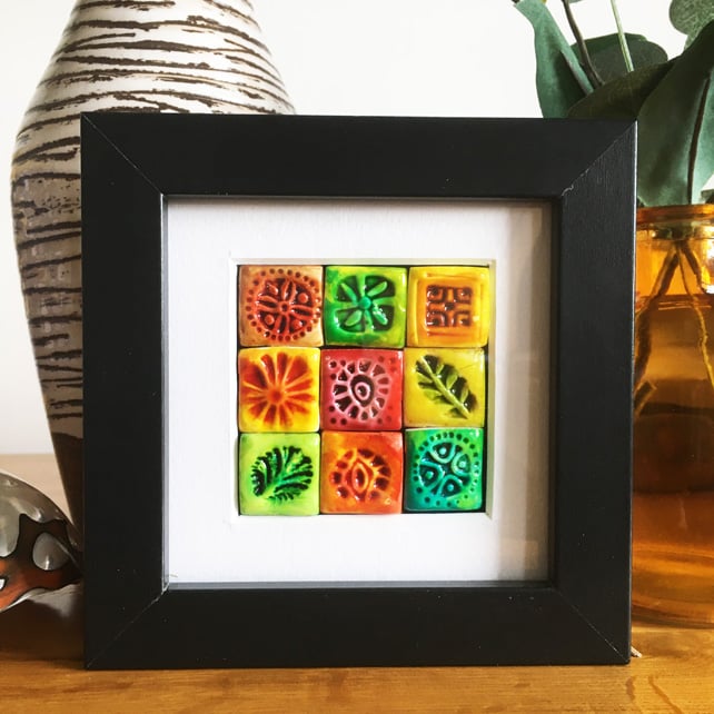 The mosaic has been created with nine tiny handmade polymer clay tiles which I've debossed and painted.