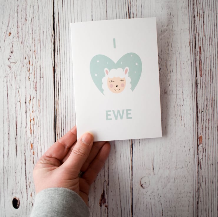 I 'Heart' Ewe card featuring a cute sheep in a mint green heart with coordinating text