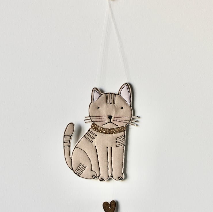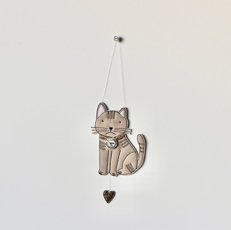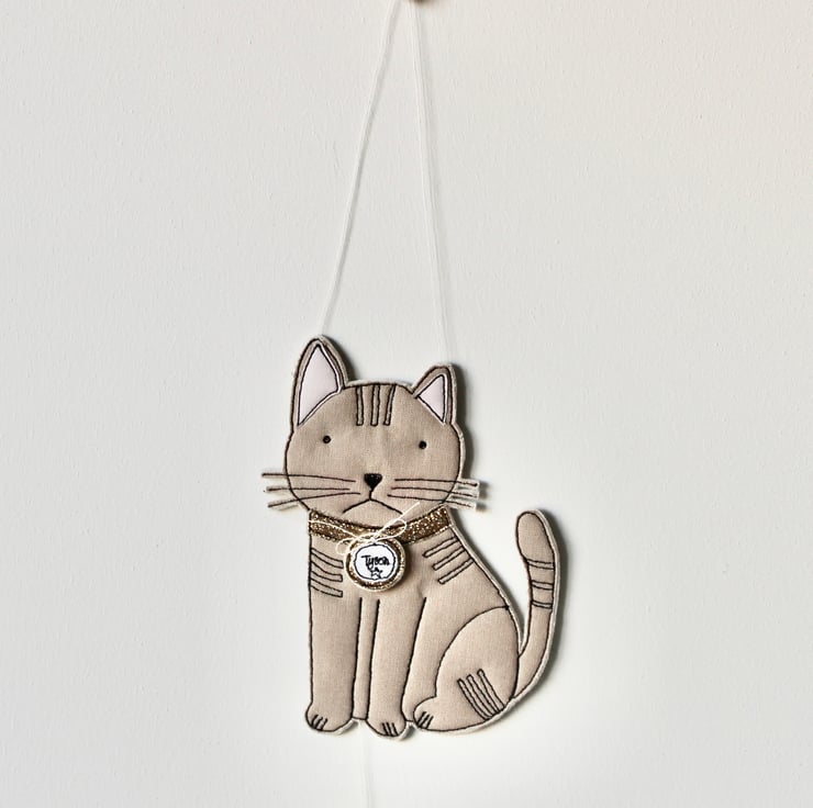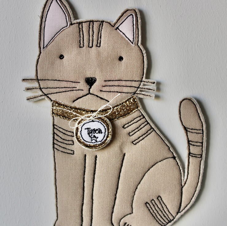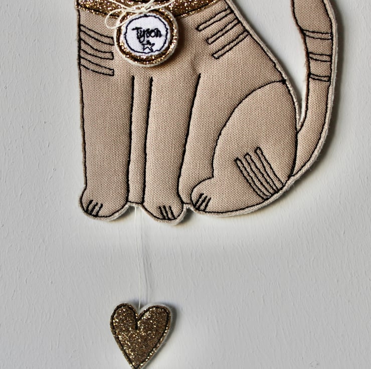 'Tyson' cat is created using freehand machine embroidery and multiple layers of cloth cloth, glitter fabric and 100% wool felt. Cut out by hand using very sharp scissors with a linen thread to suspend.