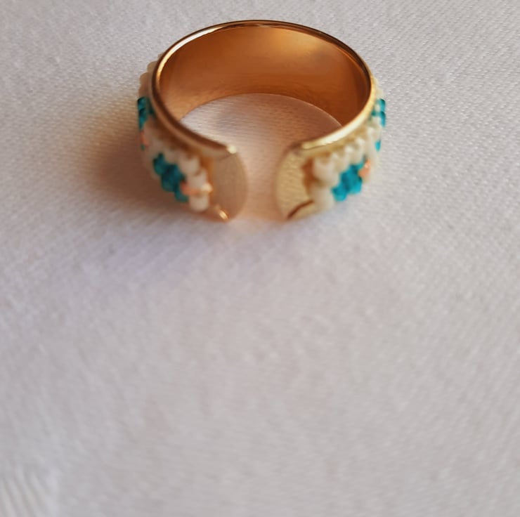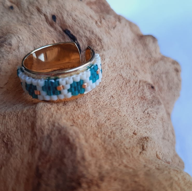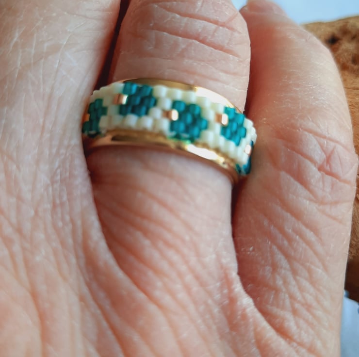 This lovely little ring features a leaf/clover design made with Japanese delica beads. The beadwork band is on a gold tone ring base which is adjustable. The inside diameter of the ring is approx. 1.8cm and the outside diameter is approx. 2.2cm, and the width is approx. 0.8cm. This ring would make a nice little gift for a friend or a treat for yourself and comes in a little organza bag.