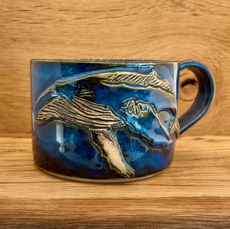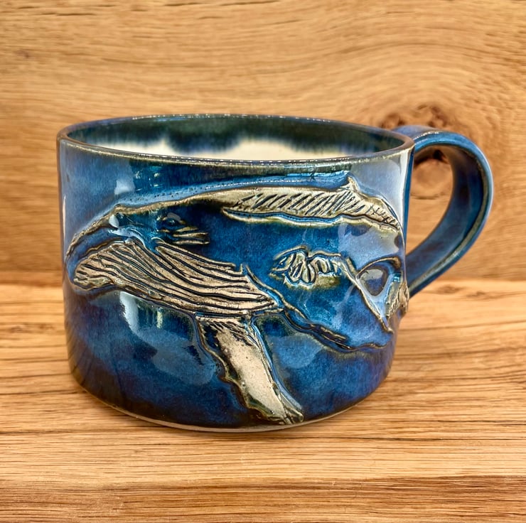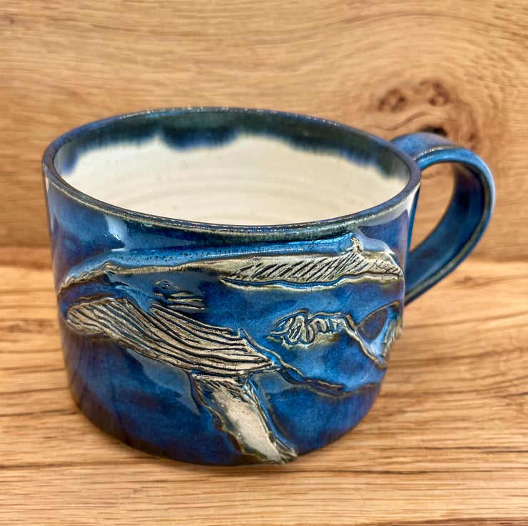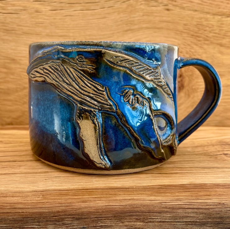 Fired to 1260 degrees with a gorgeous moving midnight blue glaze to enhance the majestic humpback whale. The whale has been hand carved in relief and glazed to evoke swimming through the ocean. The inner glaze is a vintage white to enhance the cups throwing rings.
