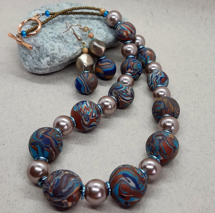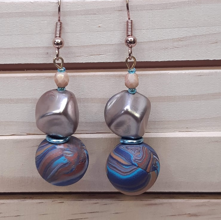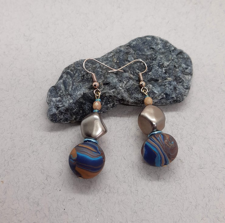 Exclusive dangly polymer clay earrings in a bronze turquoise and navy swirl design. The handmade bead measures 14.6mm with a 12mm bronze nugget and 4mm apricot faceted bead to complete the look.