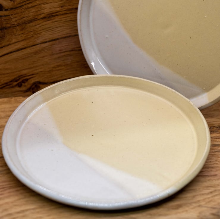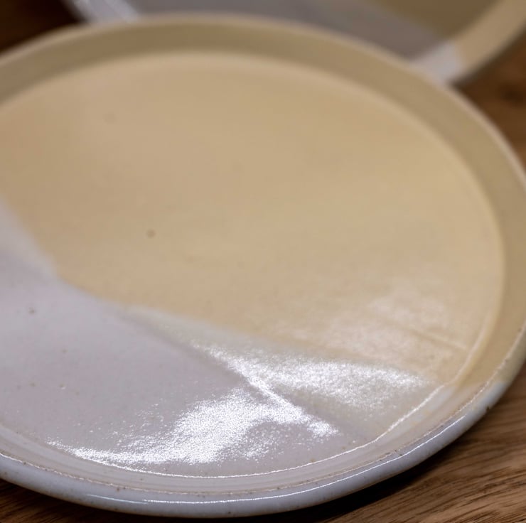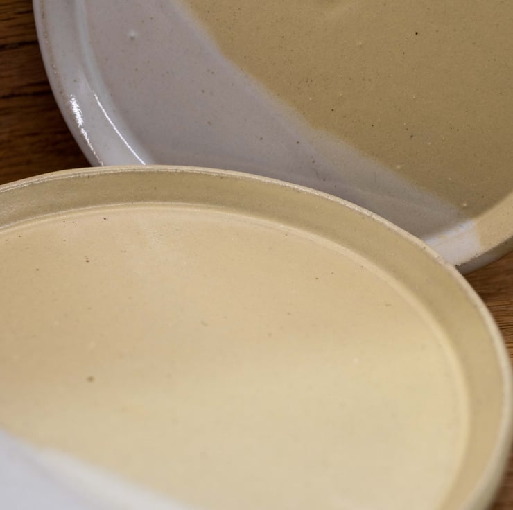 Fired to 1240 degrees with a gorgeous satin pale butter glaze to the outer surface and layered with a vintage white glaze.