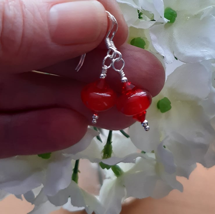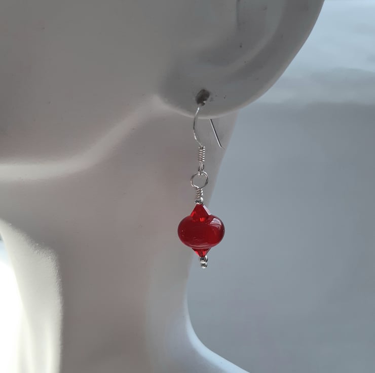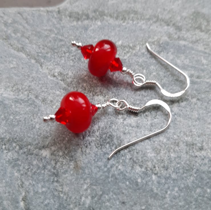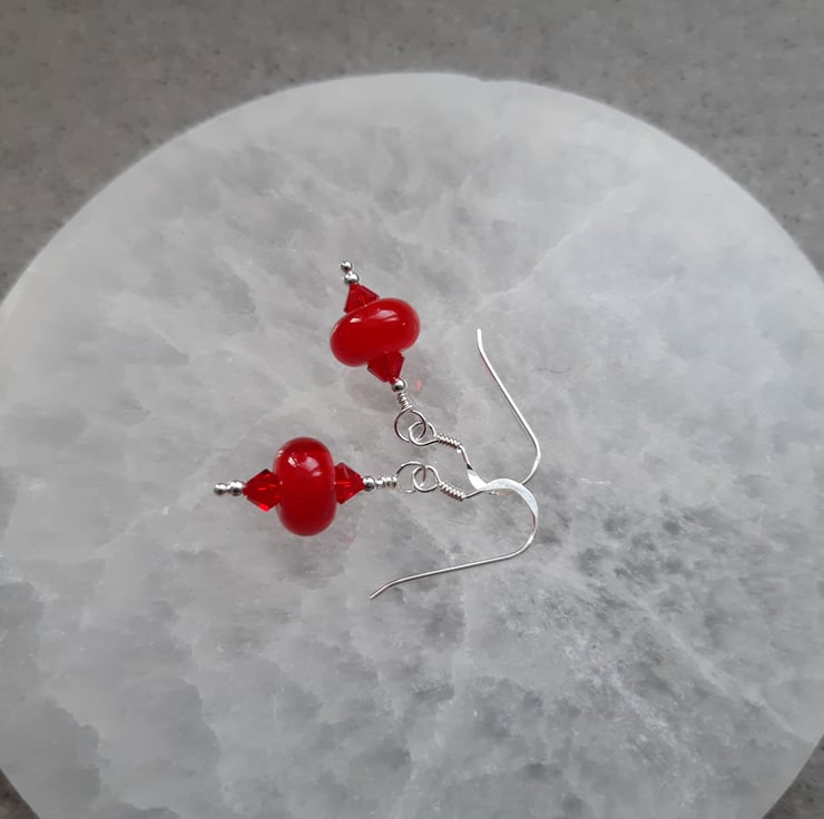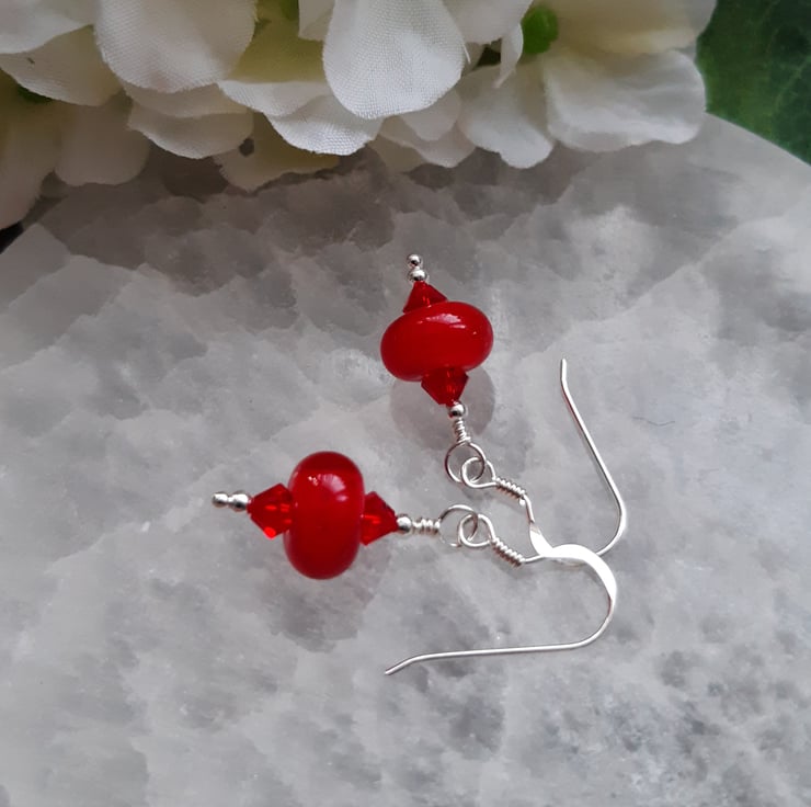 Sterling silver earrings with lovely handmade lampwork glass beads made in the UK which are red in colour with red swarovski® crystals.