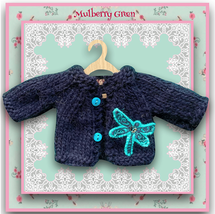 A lovely little navy blue cardigan embroidered with a sequinned dragonfly to fit the Mulberry Green characters. The cardigan is hand knitted in 100% pure Lettlopi wool and is finished off with two little turquoise buttons.