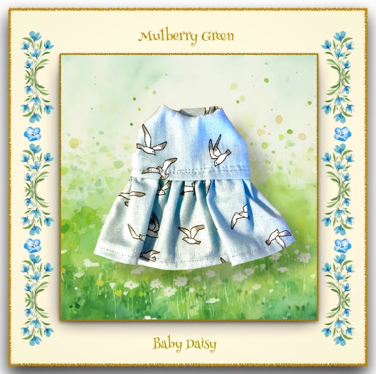 A pretty little pale blue dress in a seagull print for baby Daisy. The dress is handmade from best quality cotton, has a lined bodice and fastens at the back with a little popper