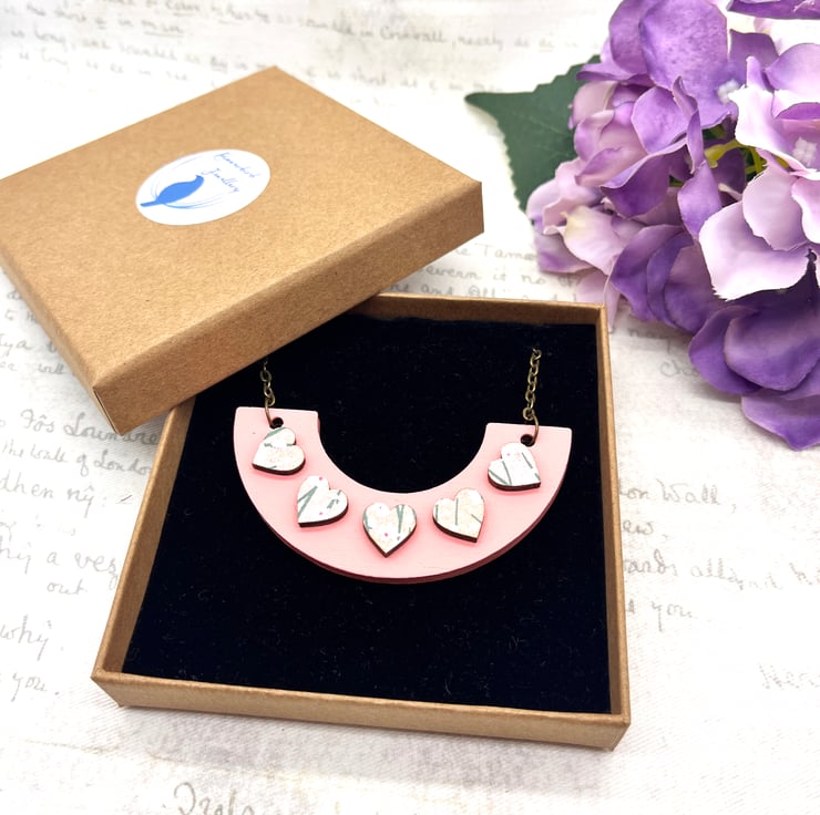 The centre of attention for this necklace though, are these beautiful wooden hearts, adorned with Japanese washi paper, featuring little white daisies, green stems and leaves and metallic gold details on pale pink background. gorgeous.