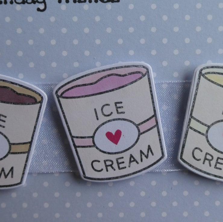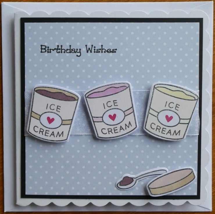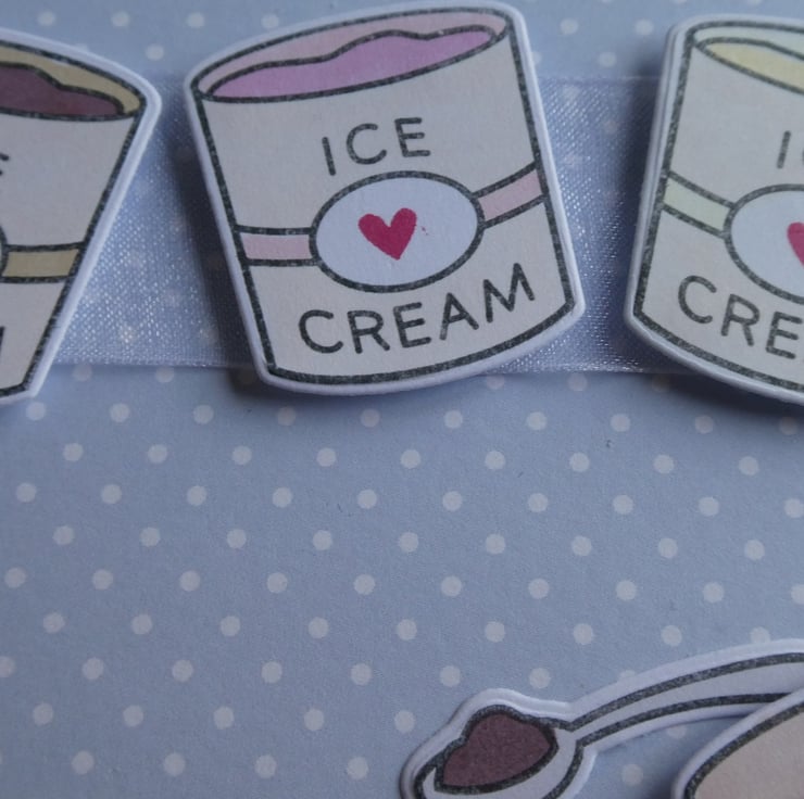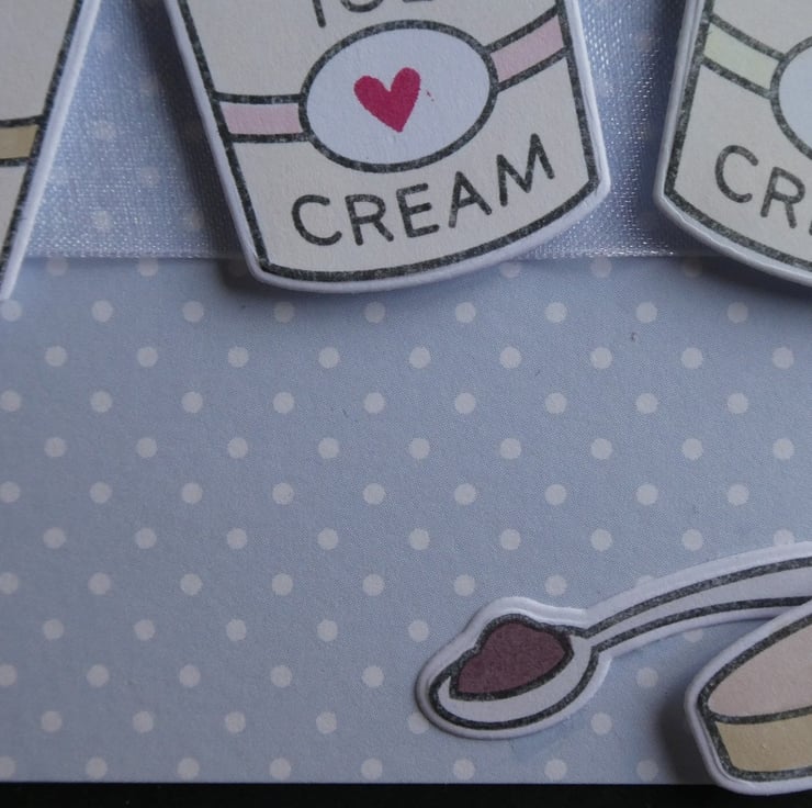 A square of pale blue and white polka dot card has been wrapped around the centre with a length of white organza ribbon and 3 hand coloured tubs of ice cream have then been attached, raised on foam to add dimension.