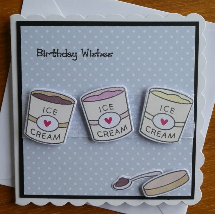 An ice cream tub lid and a spoon ready loaded have been added at the bottom and the greeting Birthday Wishes has been hand stamped at the top.