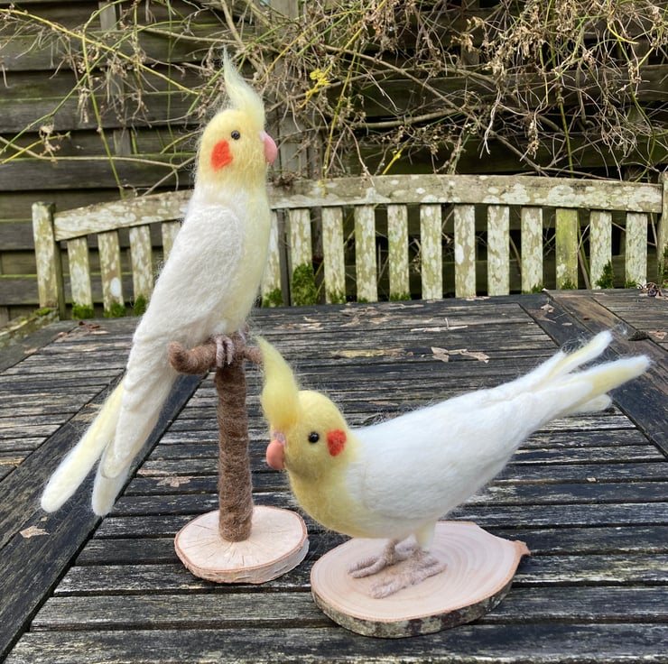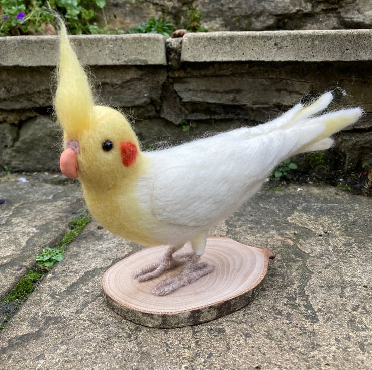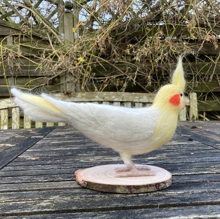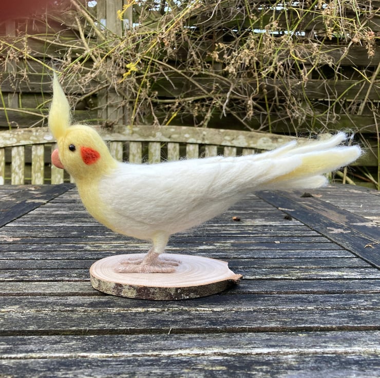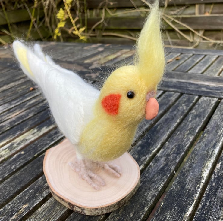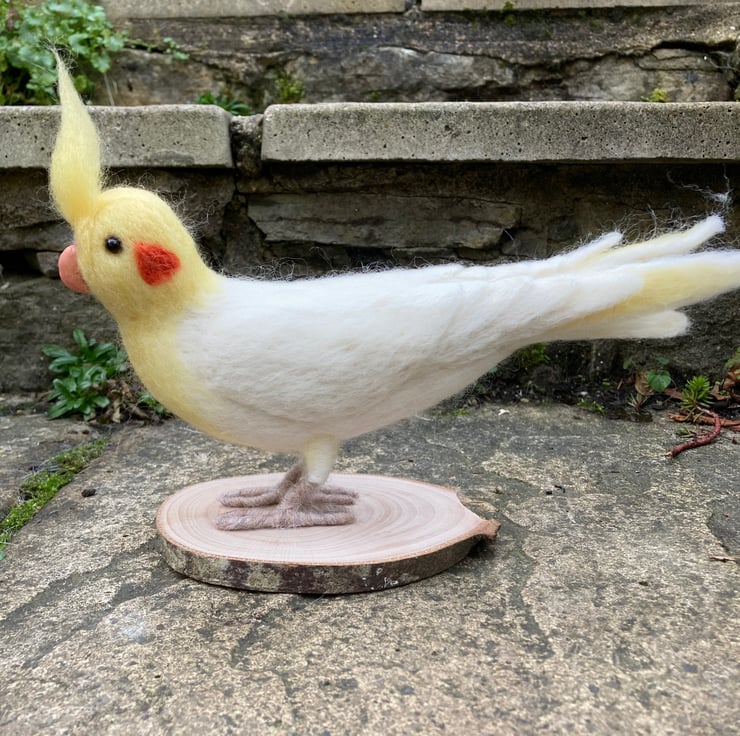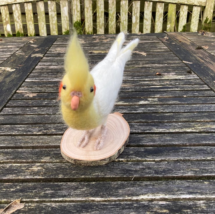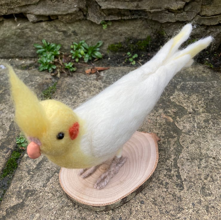 This is a walking version of a much loved white cockatiel that has been made using a needle felting technique. Woollen fibres have been sculpted into shape using a barbed felting needle with merino wool fibres in appropriate colours added to the surface and wings and tail added. A silk clay beak, beaded eyes and wool wrapped wire feet complete the bird. He has been mounted on a rustic wooden slice.